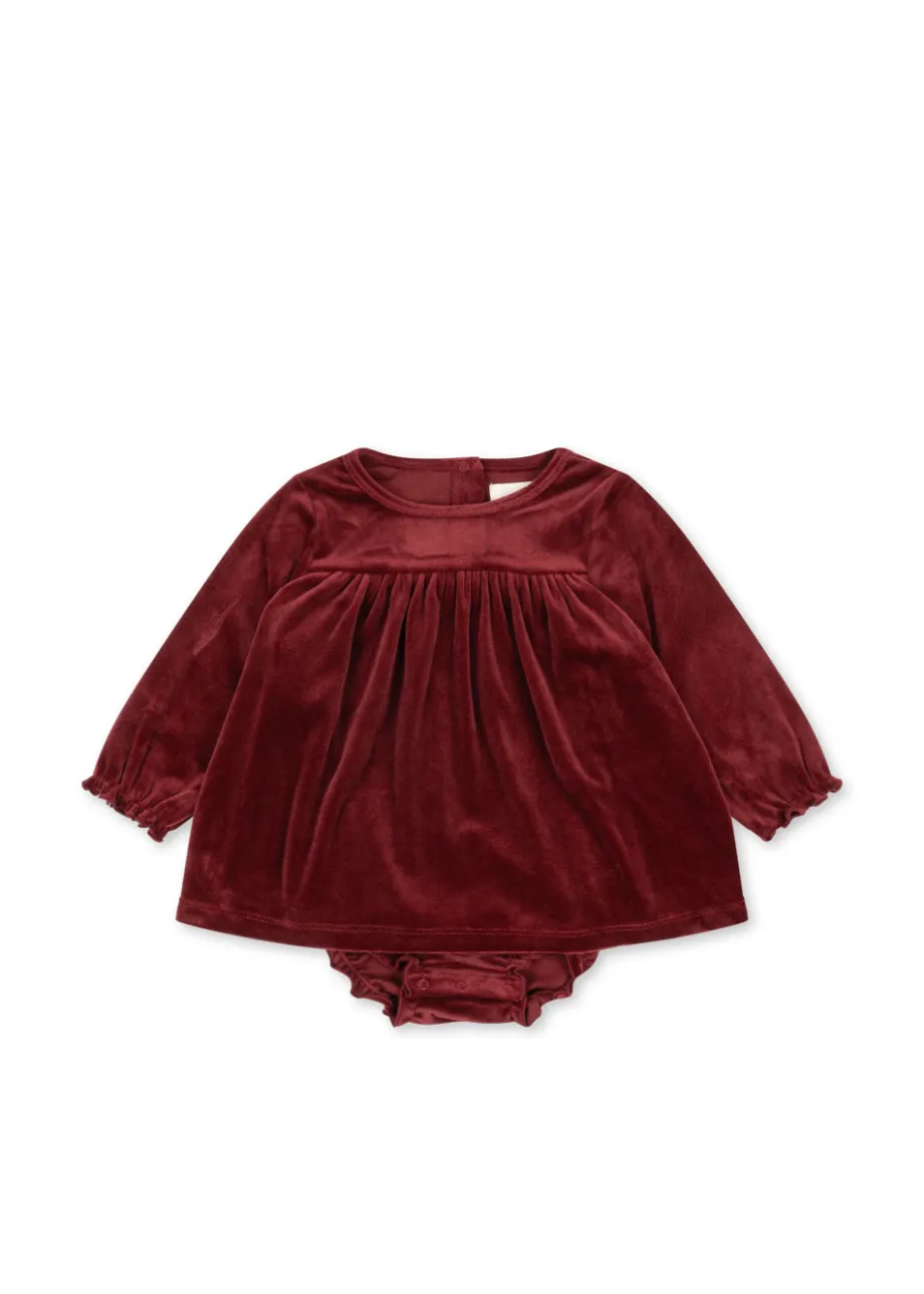 Romper-kjole i blød velour. Med trykknapper i skridtet. der gør den nem at få på. Lavet af 95 % genanvendt polyester og 5 % elastan Dette produkt indeholder mindst 50 % GRS-cert