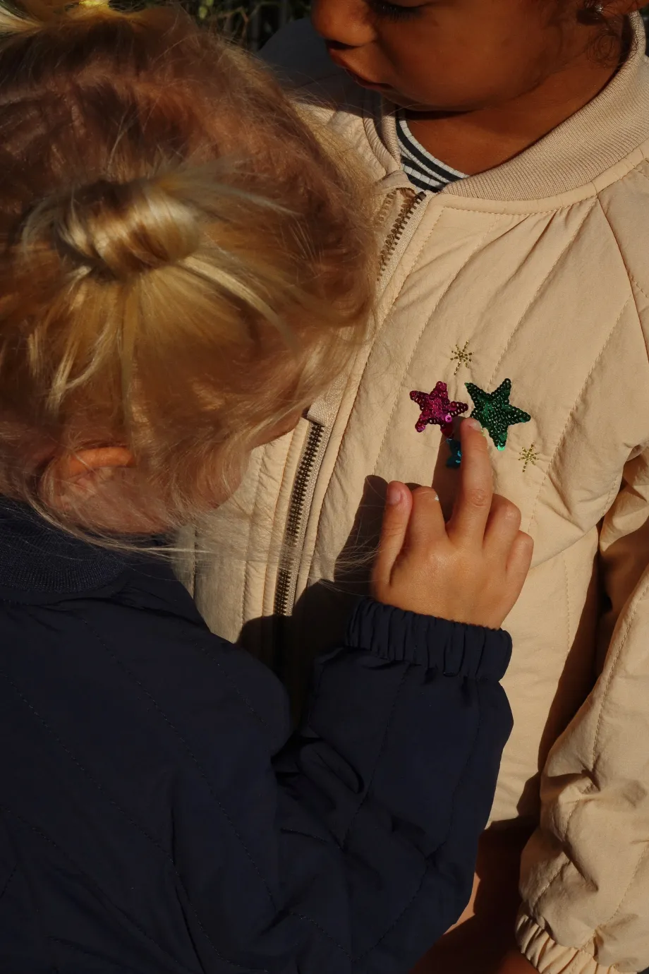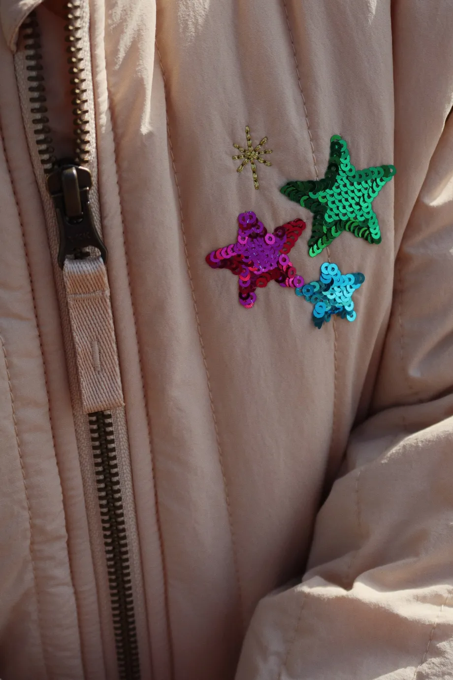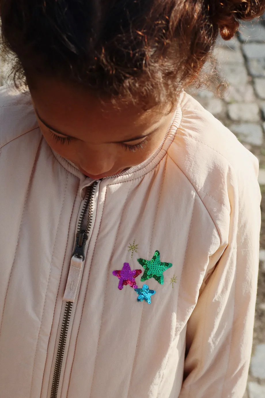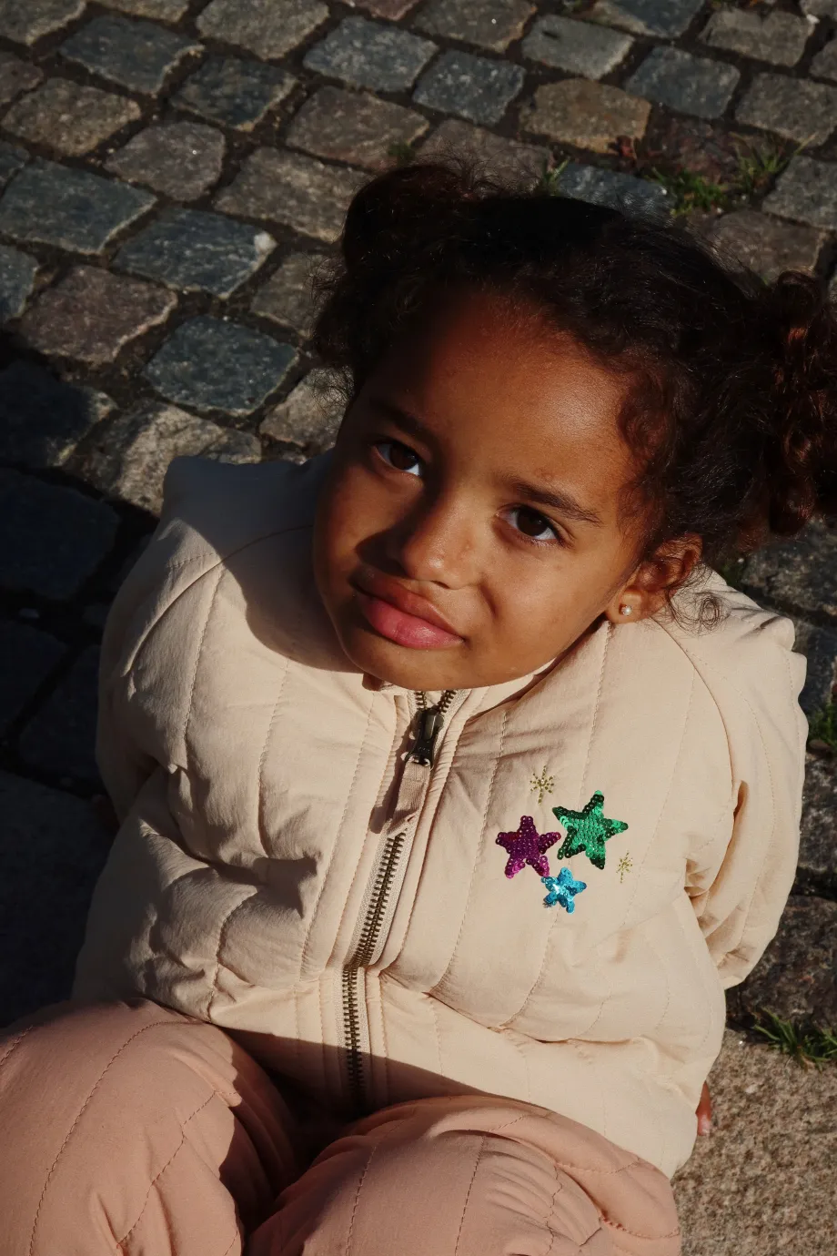 Vandafvisende og vindtæt termojakke med dekorativt pailletmønster på ryggen. Lavet af: Yderlag: 100 % nylon. For: 100 % bomuld og 100 % polyester. Polstring: 100 % polyester. Tekni