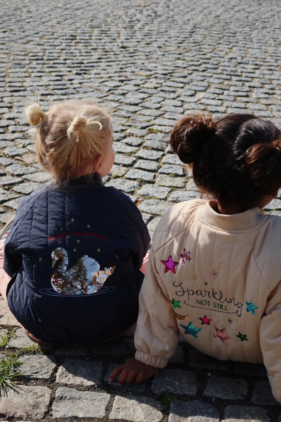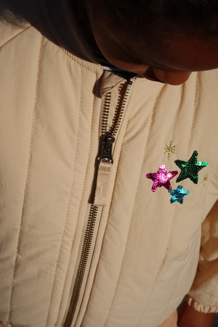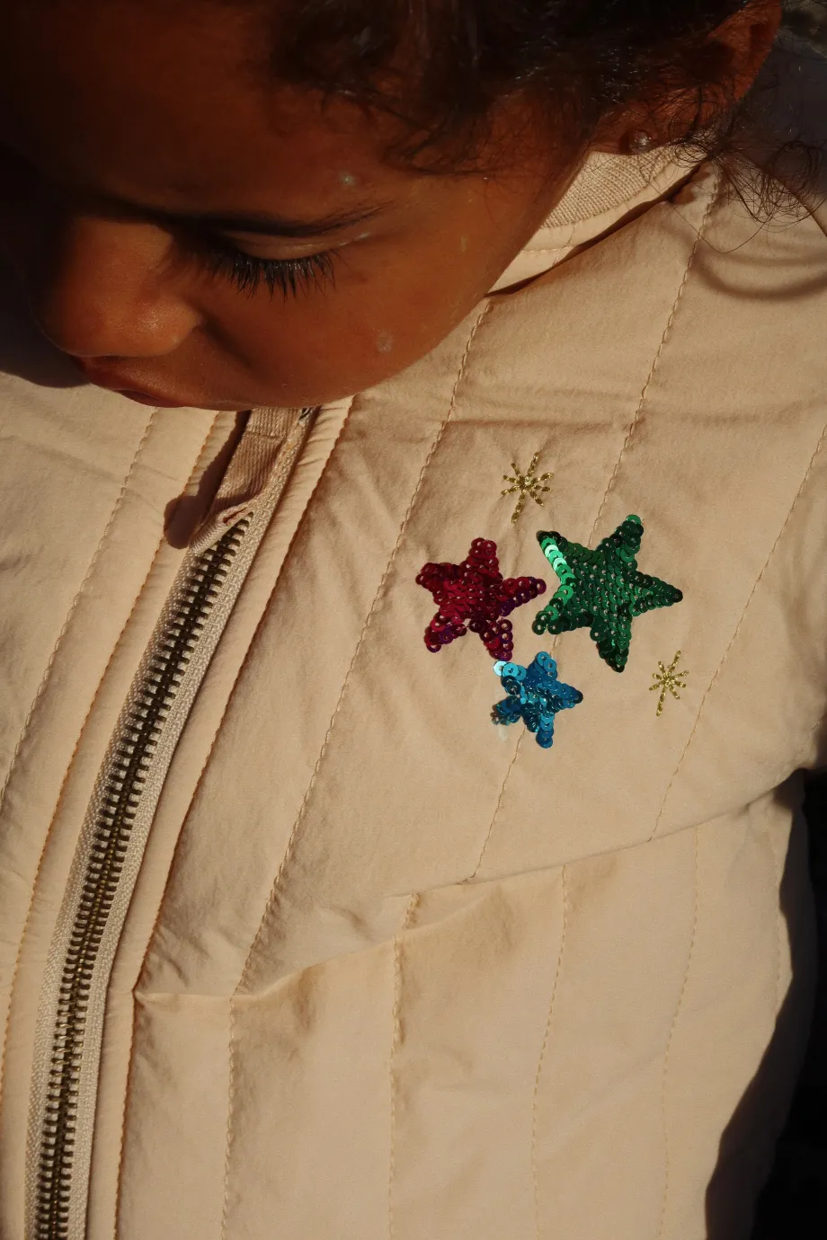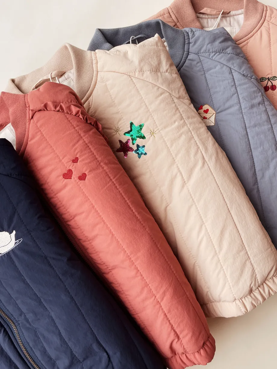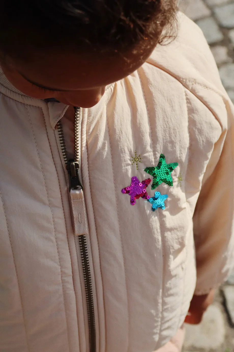 Vandafvisende og vindtæt termojakke med dekorativt pailletmønster på ryggen. Lavet af: Yderlag: 100 % nylon. For: 100 % bomuld og 100 % polyester. Polstring: 100 % polyester. Tekni