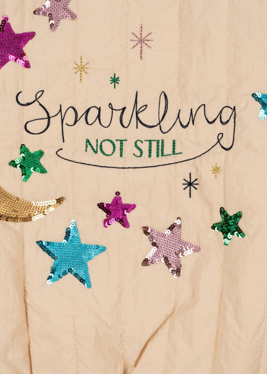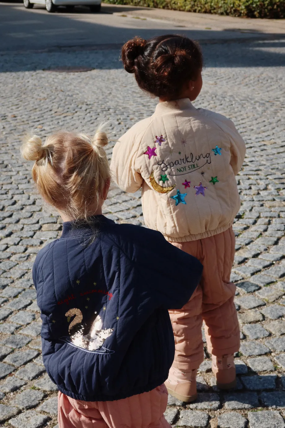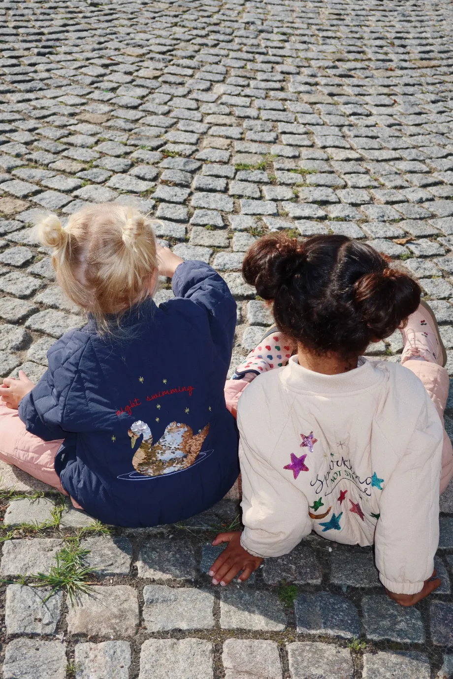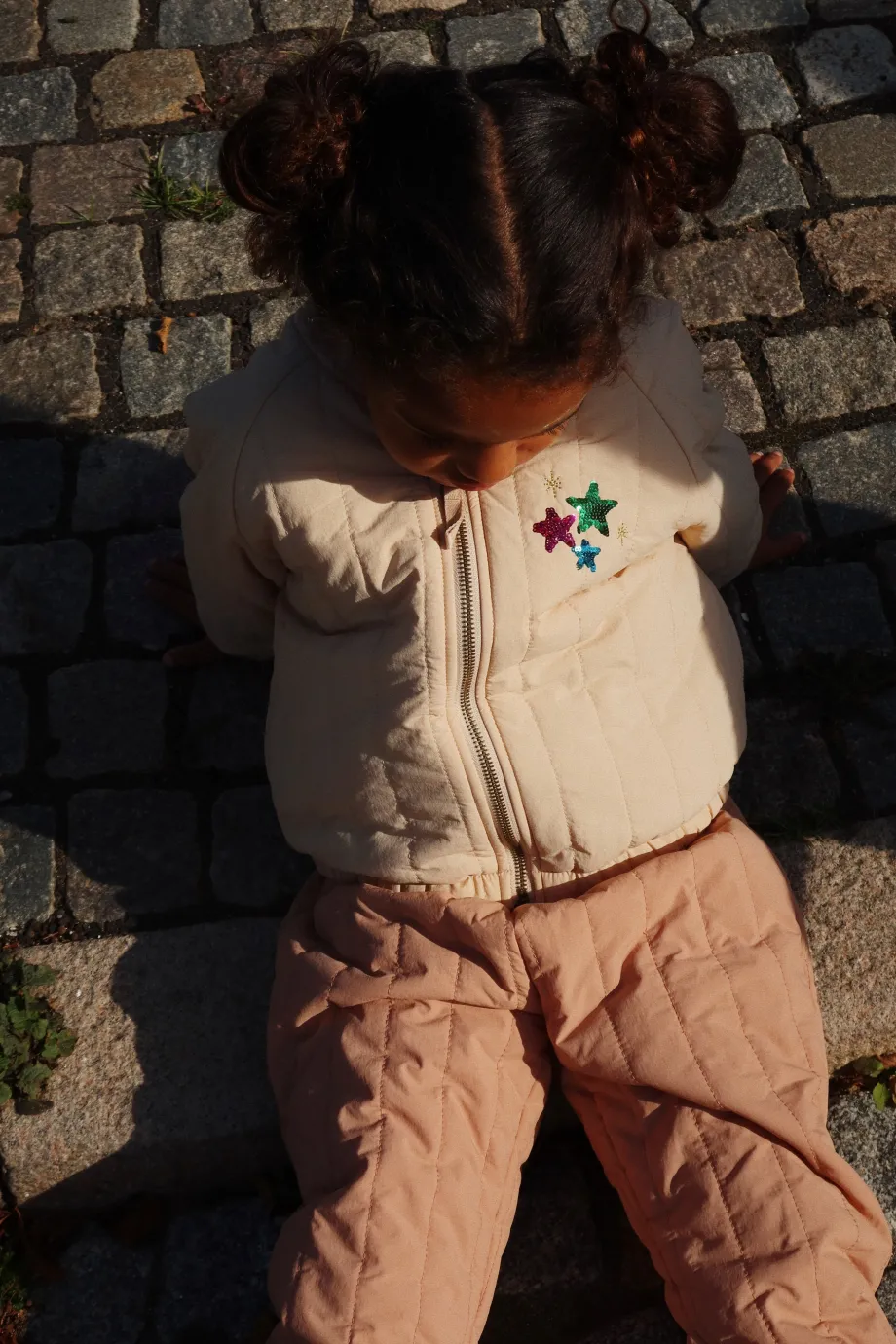 Vandafvisende og vindtæt termojakke med dekorativt pailletmønster på ryggen. Lavet af: Yderlag: 100 % nylon. For: 100 % bomuld og 100 % polyester. Polstring: 100 % polyester. Tekni