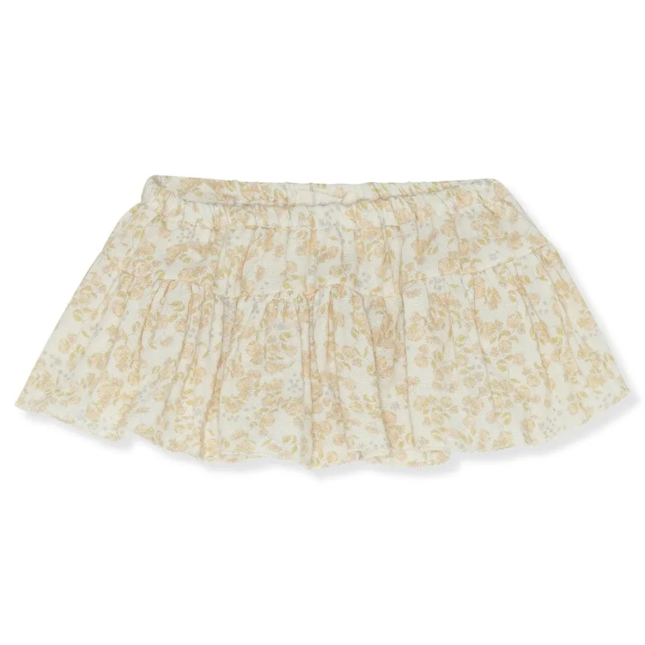 Bløde bloomers i 100 procent økologisk musselinsbomuld. Designet med elastisk talje. benåbninger med babylockkanter og et flæseskørt med vidde.