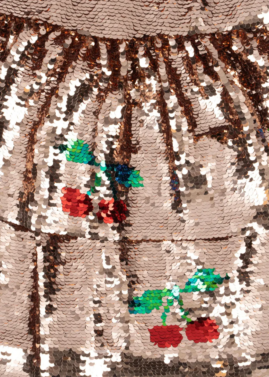 Lulu er en glitrende pailletkjole med bløde lag. Kjole i 100 % polyester med pailletter og 100 % bomuldsfor.