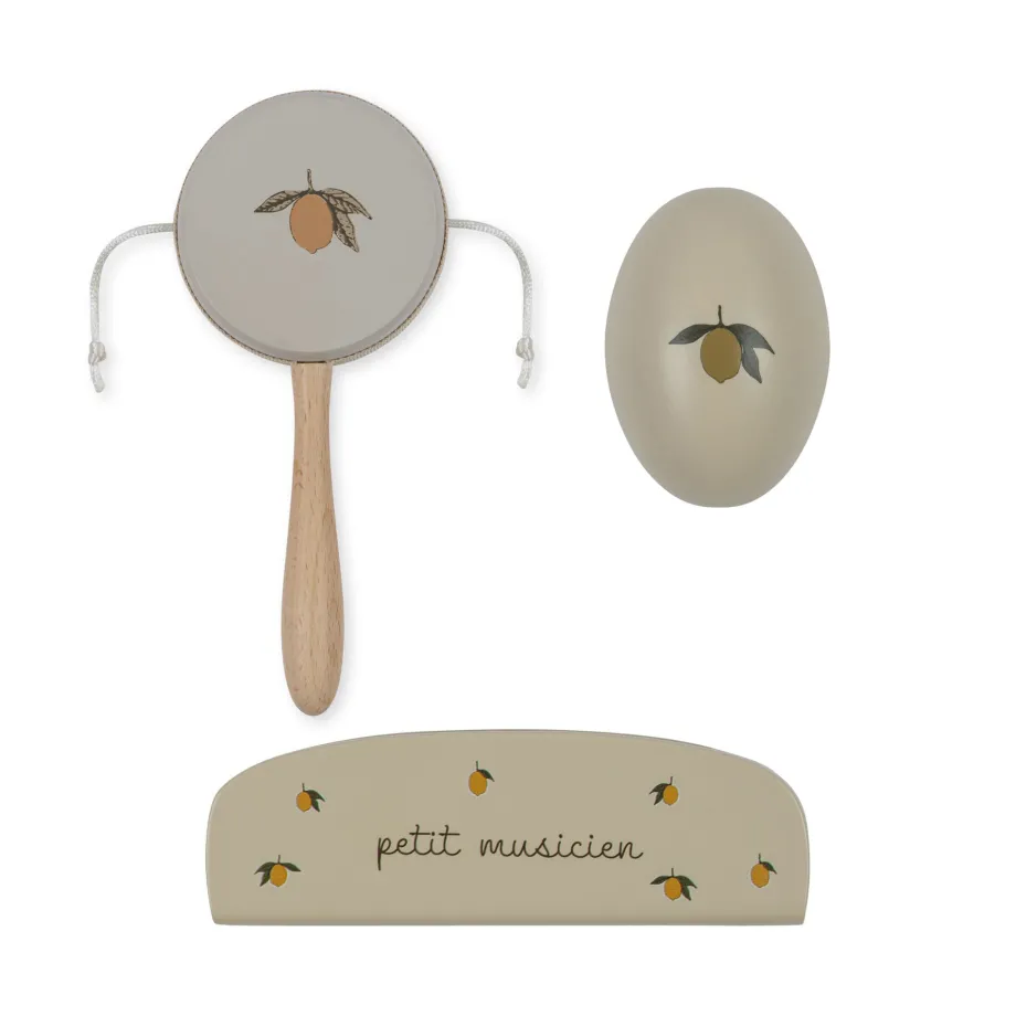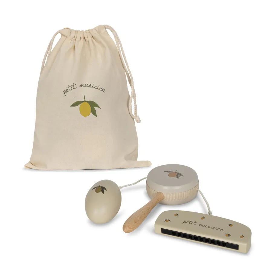 Sæt med musikinstrumenter til små musikere. som leveres i en dekorativ pose med snørelukning. Indeholder: Mundharmonika Ægformet rangle Håndtromme L: 18 x B: 13 x H: 5 cm Dette
