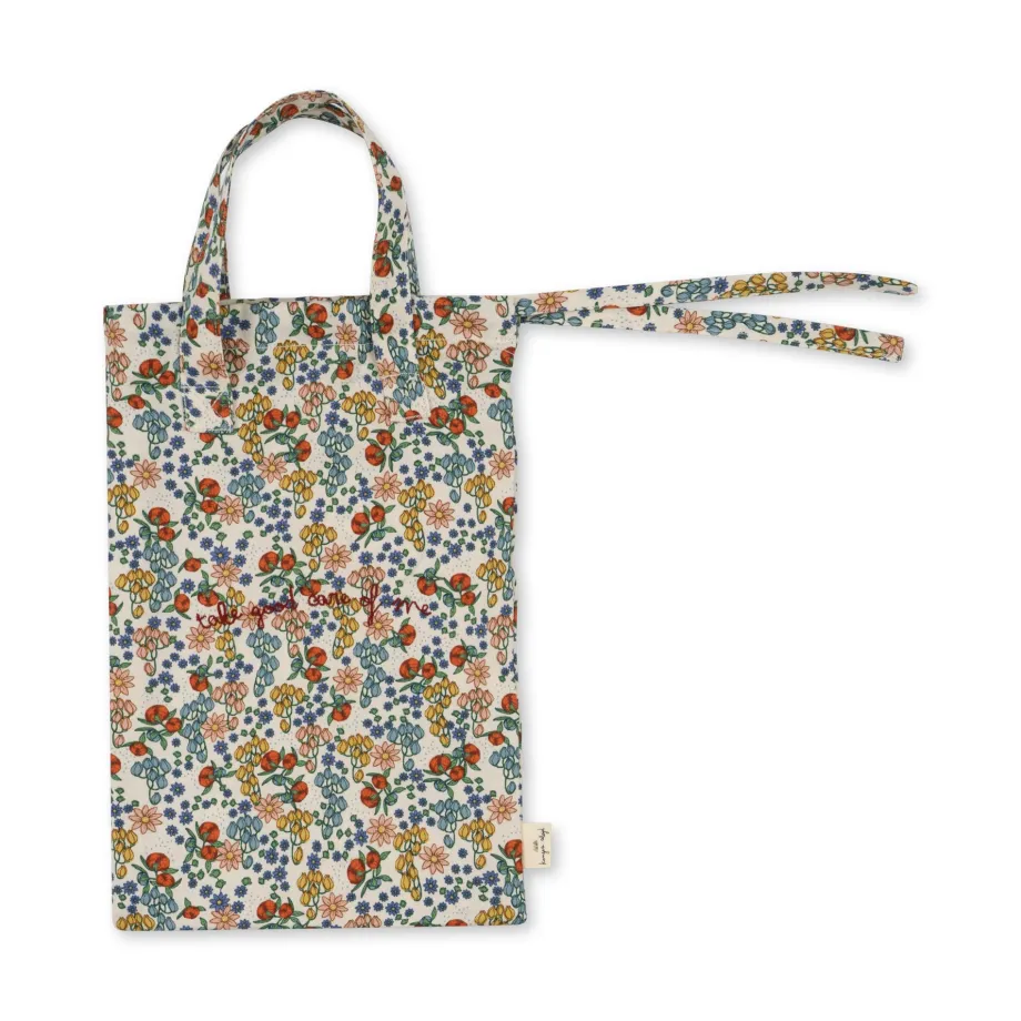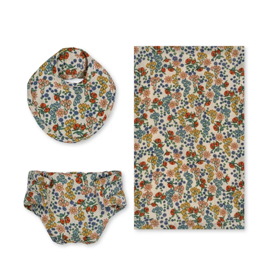 Komplet puslesæt til små dukkemødre og -fædre. Indeholder ble med velcrolukning. hagesmæk og taske i 100 % økologisk bomuld. Hagesmæk: H: 8.5 cm x B: 17 cm Pose: H: 28 cm x B: 19
