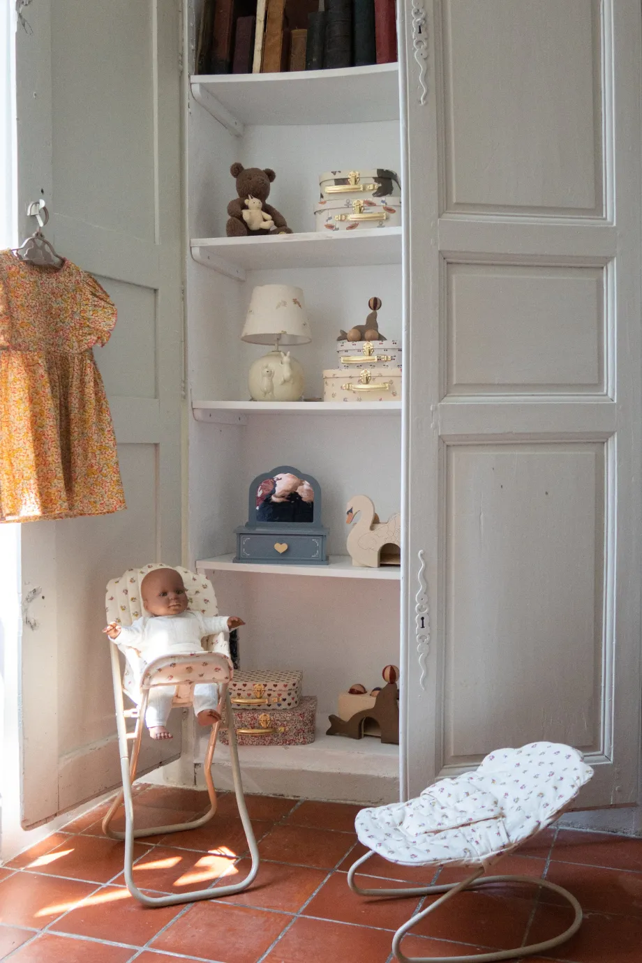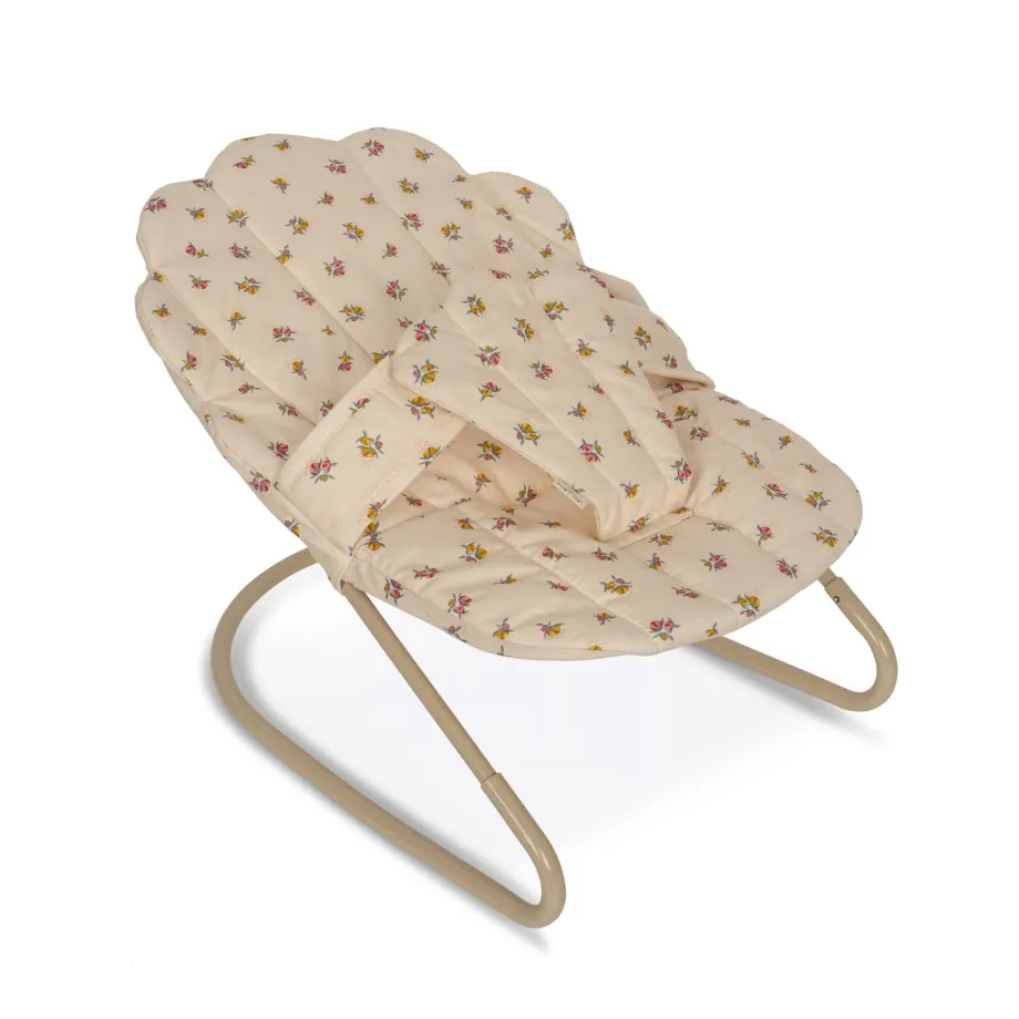 Skråstol til dukker med nem velcrolukning. der passer til en 40 cm lang dukke. Stofsædet er fremstillet af genanvendt bomuld med polstring af genanvendt polyester. Sædet er let at