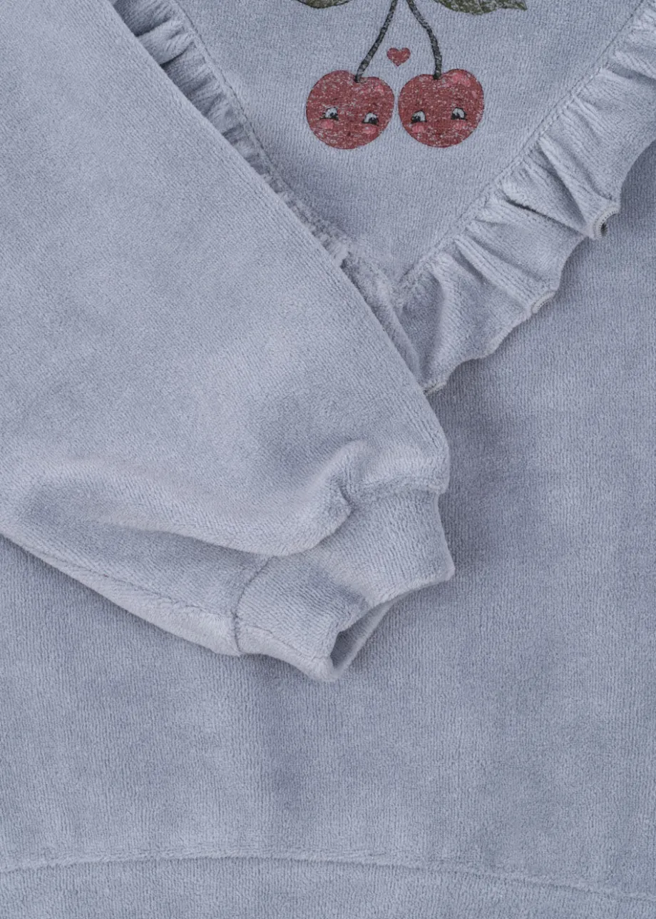 Blød sweatshirt i velour med flæsedetaljer. Lavet af 80 % økologisk bomuld og 20 % genanvendt polyester. GOTS. lavet af 80 % økologiske materialer. certificeret af CU1094701.