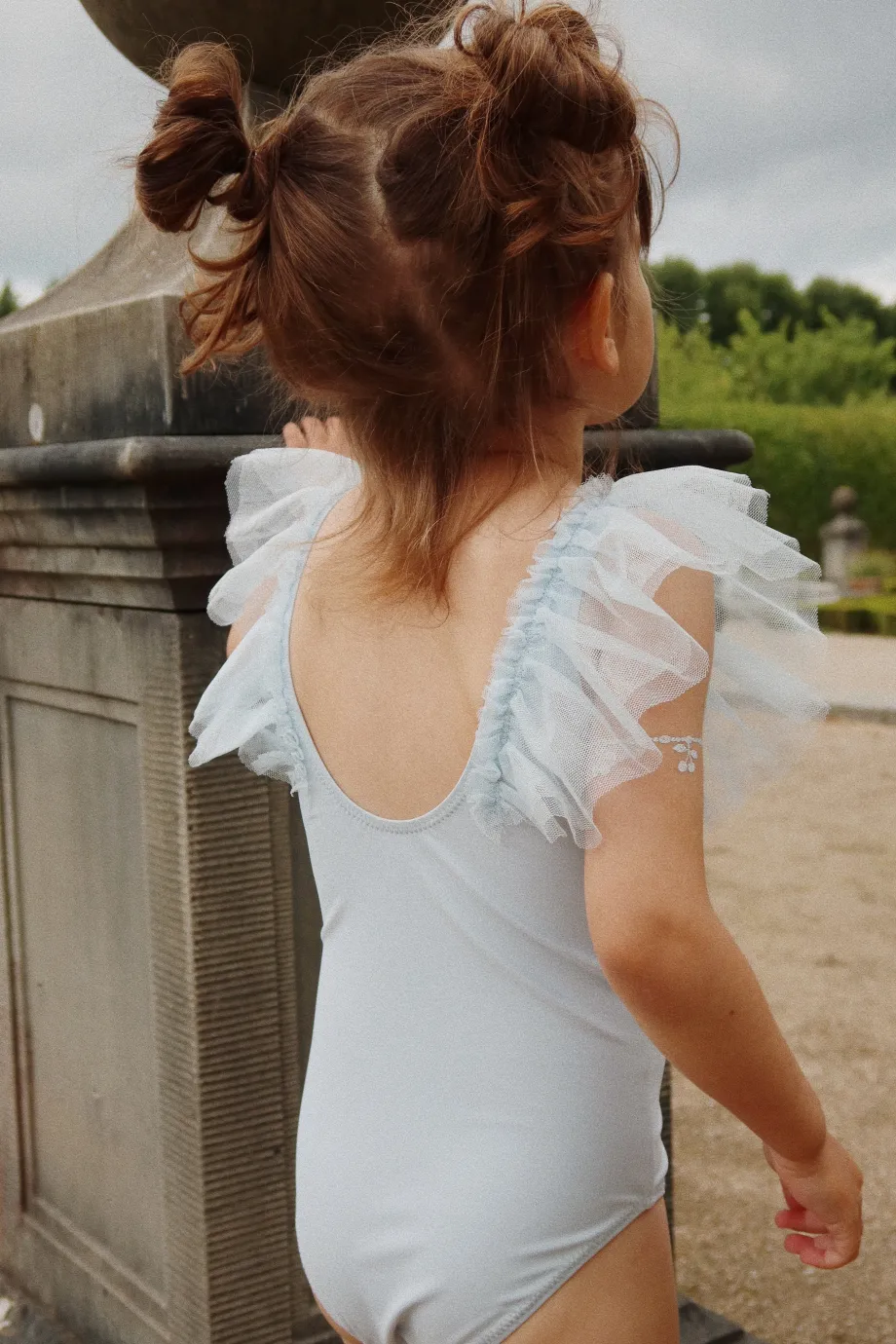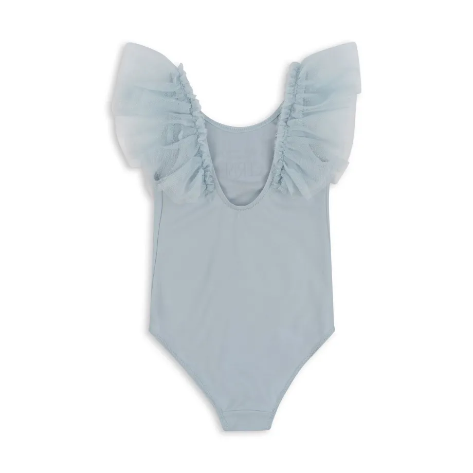 Badedragt med detaljer i lagdelt tyl. Designet med praktiske trykknapper ved benåbningerne fra størrelse 6M-18M. Fremstillet af 80% genanvendt polyester og 20% elastan Dette pr