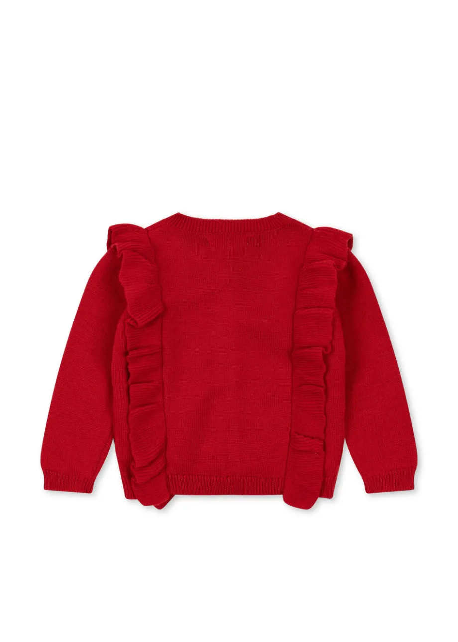 Blød og varm strikcardigan med fine strikmønstre og flæsedetaljer. Lukkes med perlemorsknapper foran. Lavet af 100 % mulesing-fri merinould.