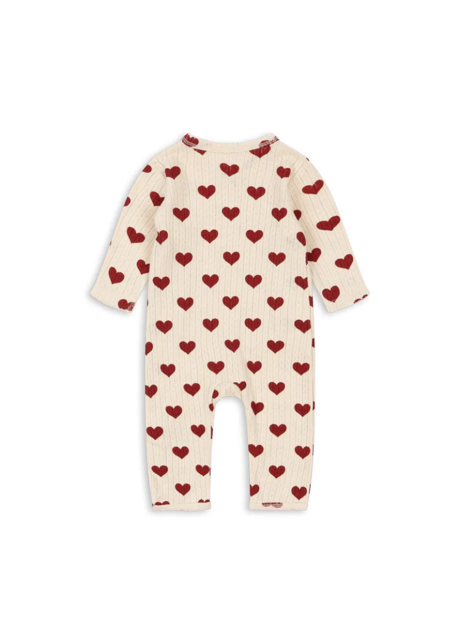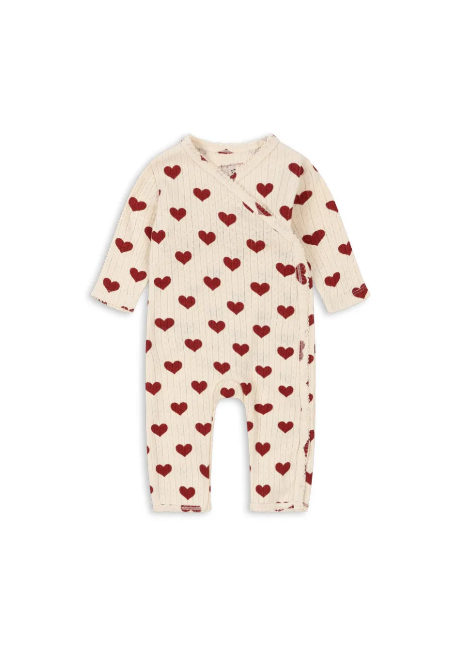 Blød heldragt til nyfødte med en praktisk slå-om-lukning. der gør det nemt at klæde barnet på. Med trykknapper langs kroppen og benene og et dekorativt hulmønster. Lavet af 100 % ø