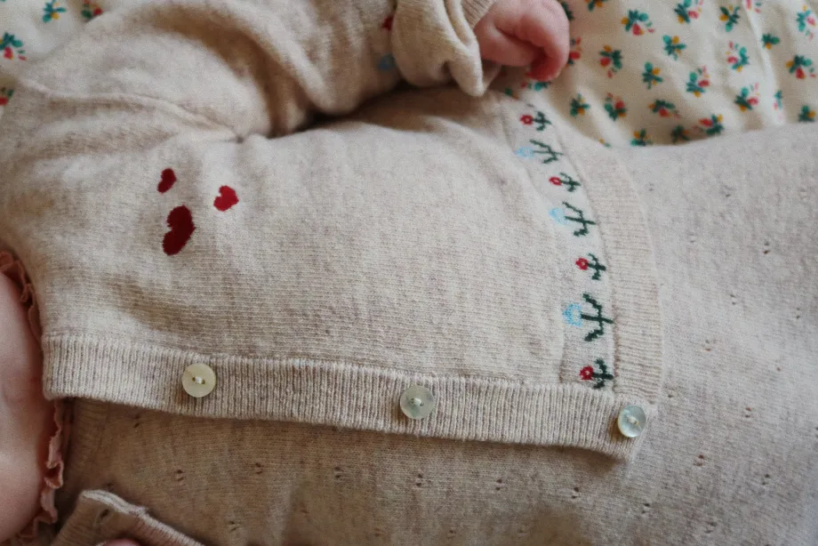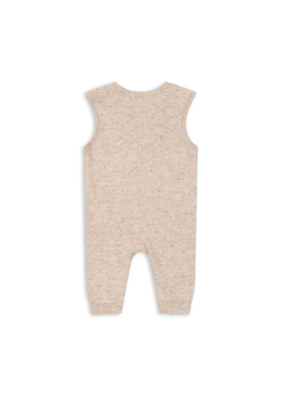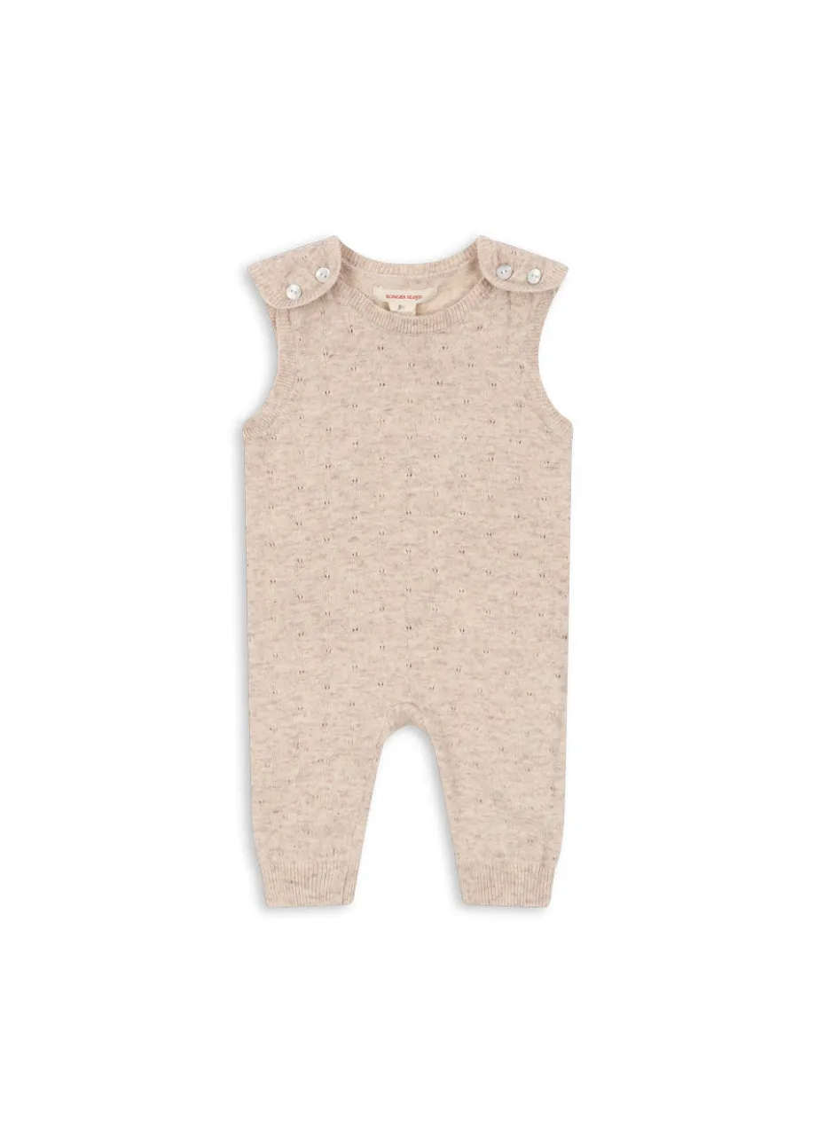 Blød heldragt uden ærmer. Designet med perlemorsknapper på skuldrene og elegant hulmønster. Fremstillet af 50% lammeuld og 50% bomuld. Vaskeinstruktioner: Dette produkt kan vask