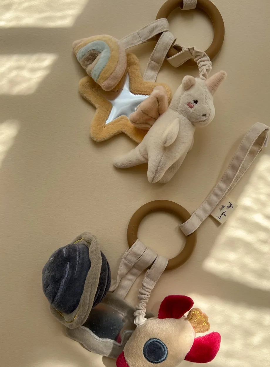 Aktivitetsring i 100 % silikone. som er sikker for babyer at bide i. På ringen sidder flere bløde figurer lavet af økologisk bomuld med fyld af genanvendt polyester. som er fastgjo
