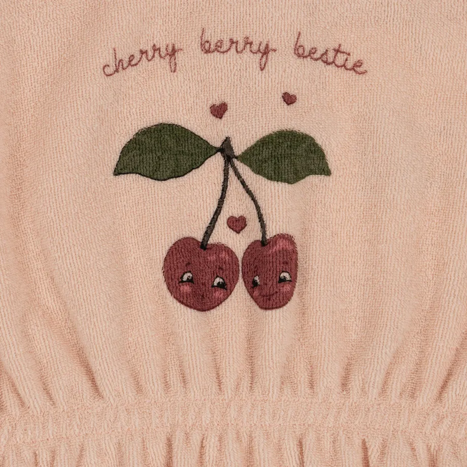 Heldragt i blødt frottéstof. Med praktiske trykknapper ved benåbningen. som gør det nemt at klæde barnet på. Fremstillet af 80% økologisk bomuld og 20% genanvendt polyester GOTS.