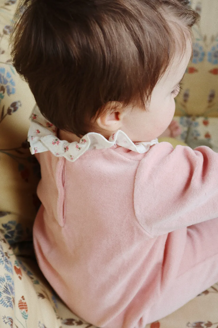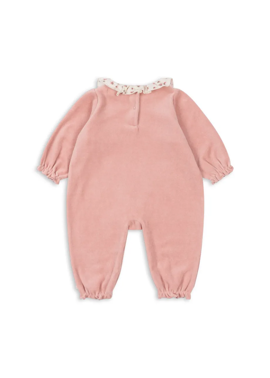 Blød velour-heldragt med en dekorativ krave og broderi på brystet. Lavet af 80 % økologisk bomuld og 20 % genanvendt polyester. GOTS. lavet af 80 % økologiske materialer. certifice