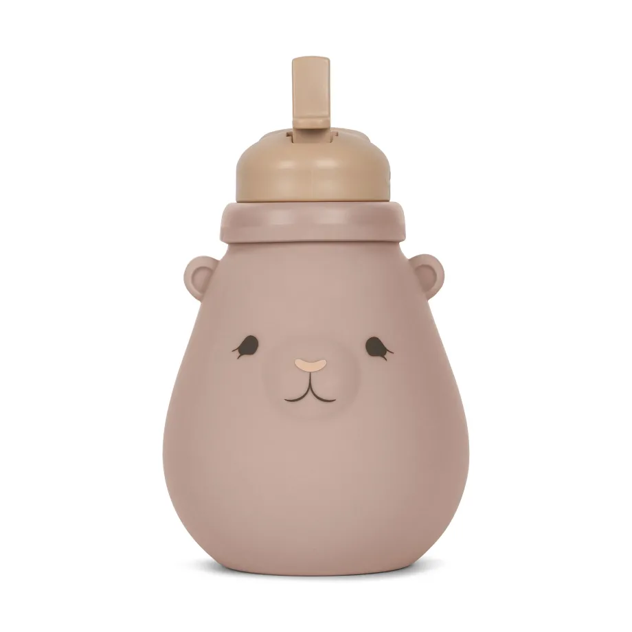 Bamseformet drikkeflaske. Låg af 100 % polypropylen. Flaske af 100 % silikone. Flaske: Tåler opvaskemaskine op til 100 °C. Tåler mikrobølgeovn. Temperatursikker:40 °C til 230 °C. L
