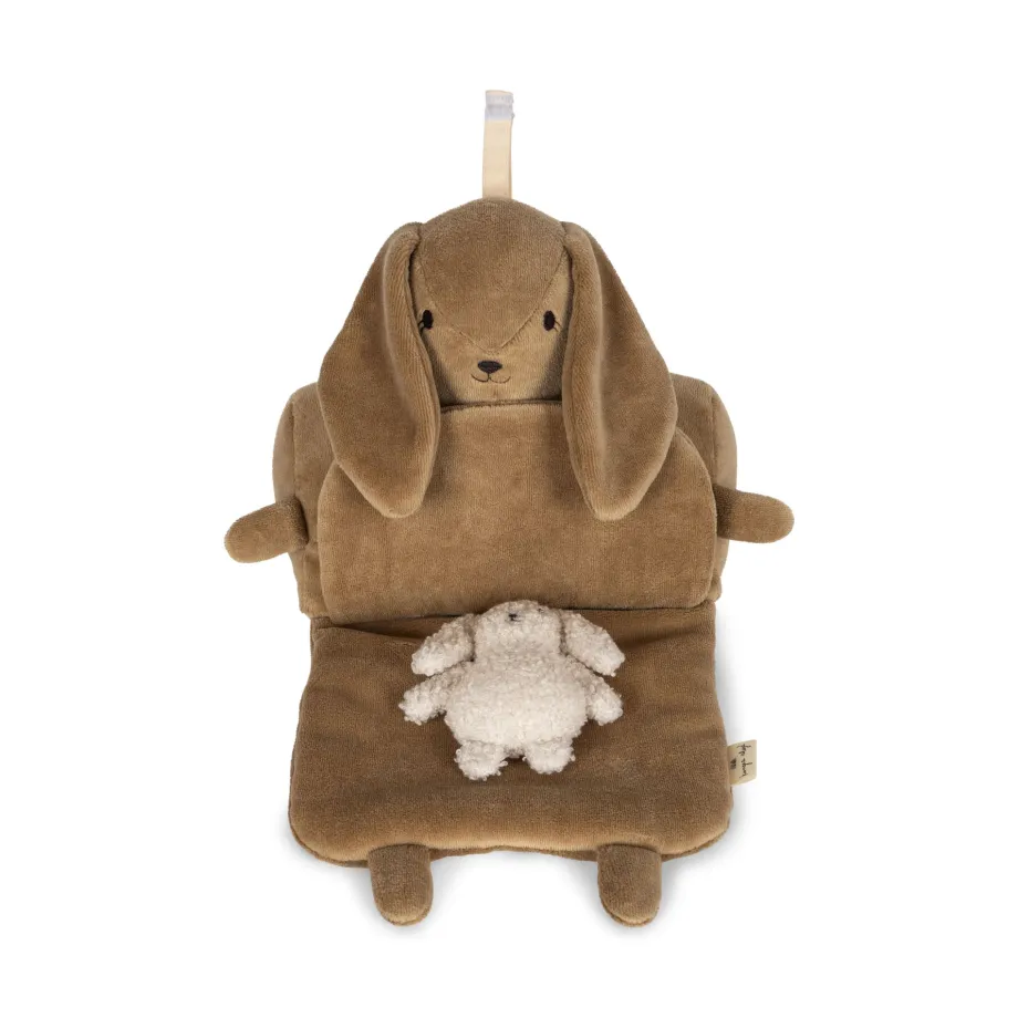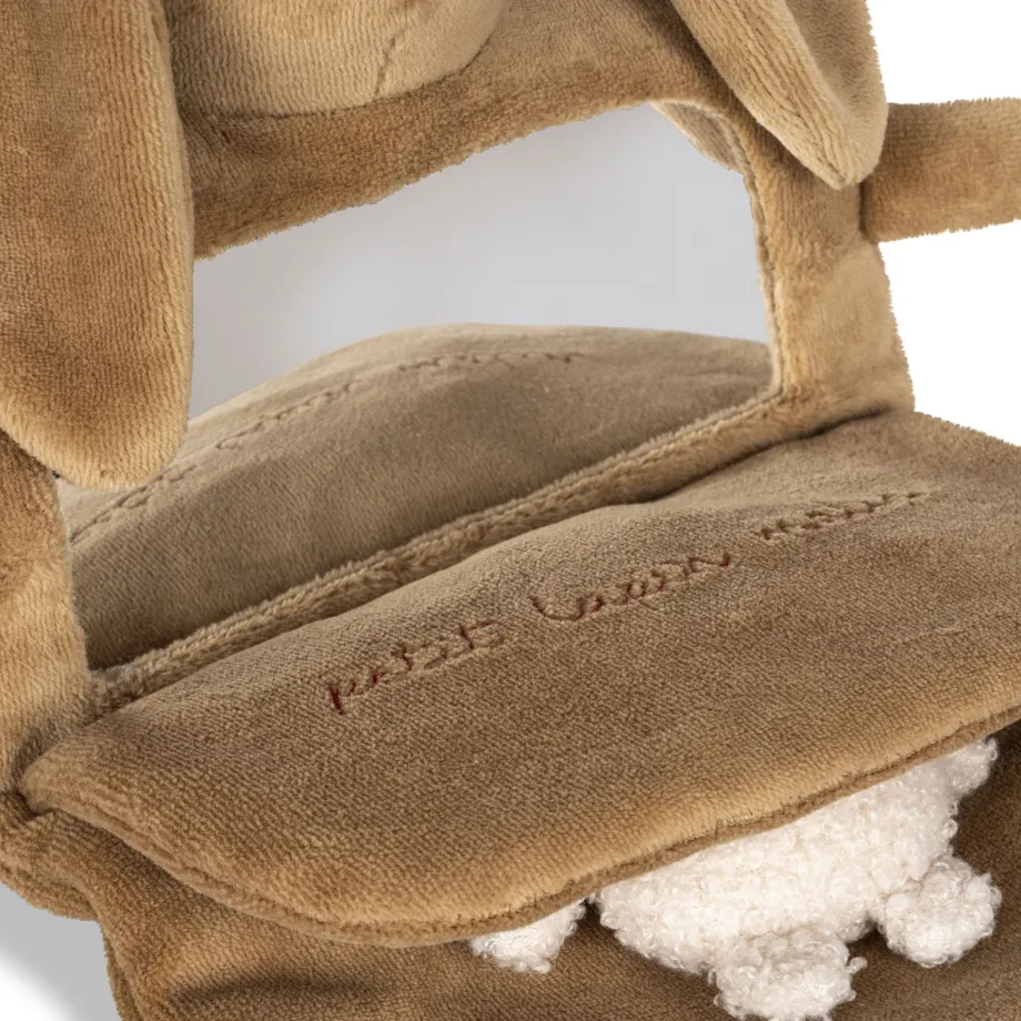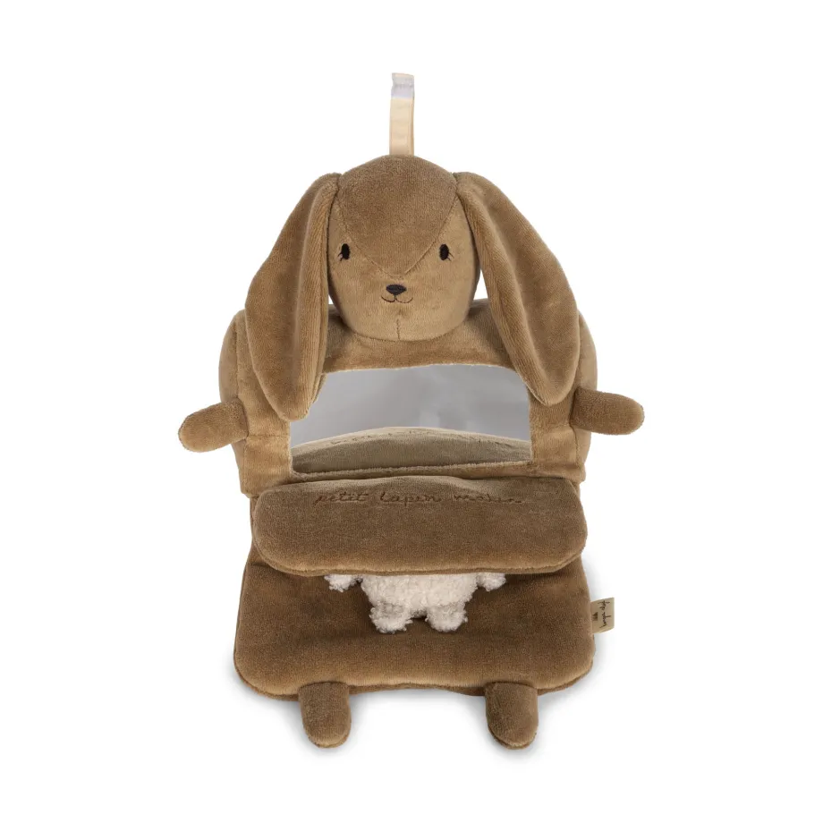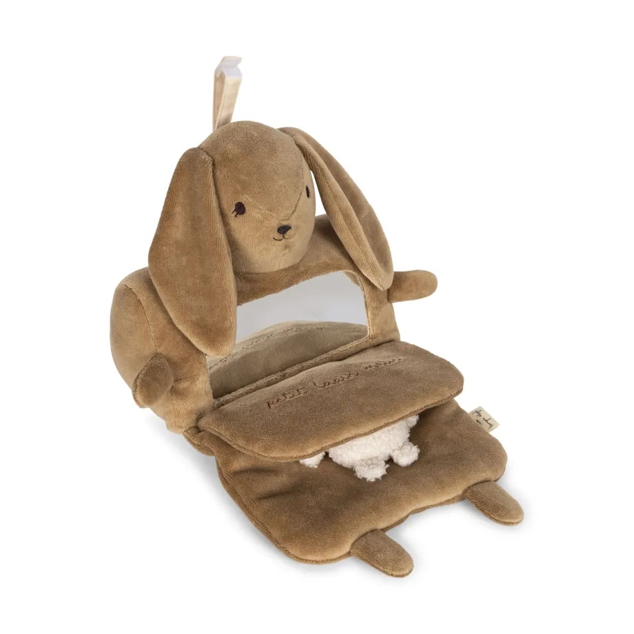 Aktivitetsbamse med spejl. der kan foldes sammen til en pude. Lavet af 80 % økologisk bomuld med fyld af 20 % polyester. Den lille bamse er lavet af 100 % genanvendt polyester