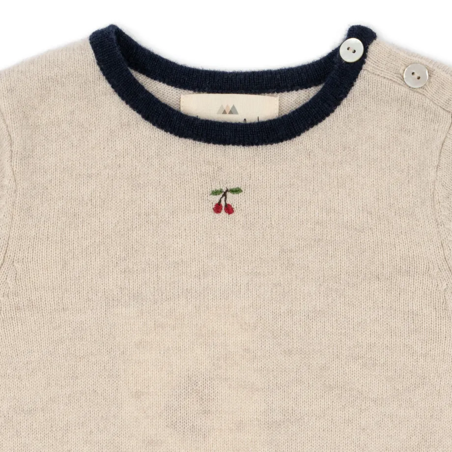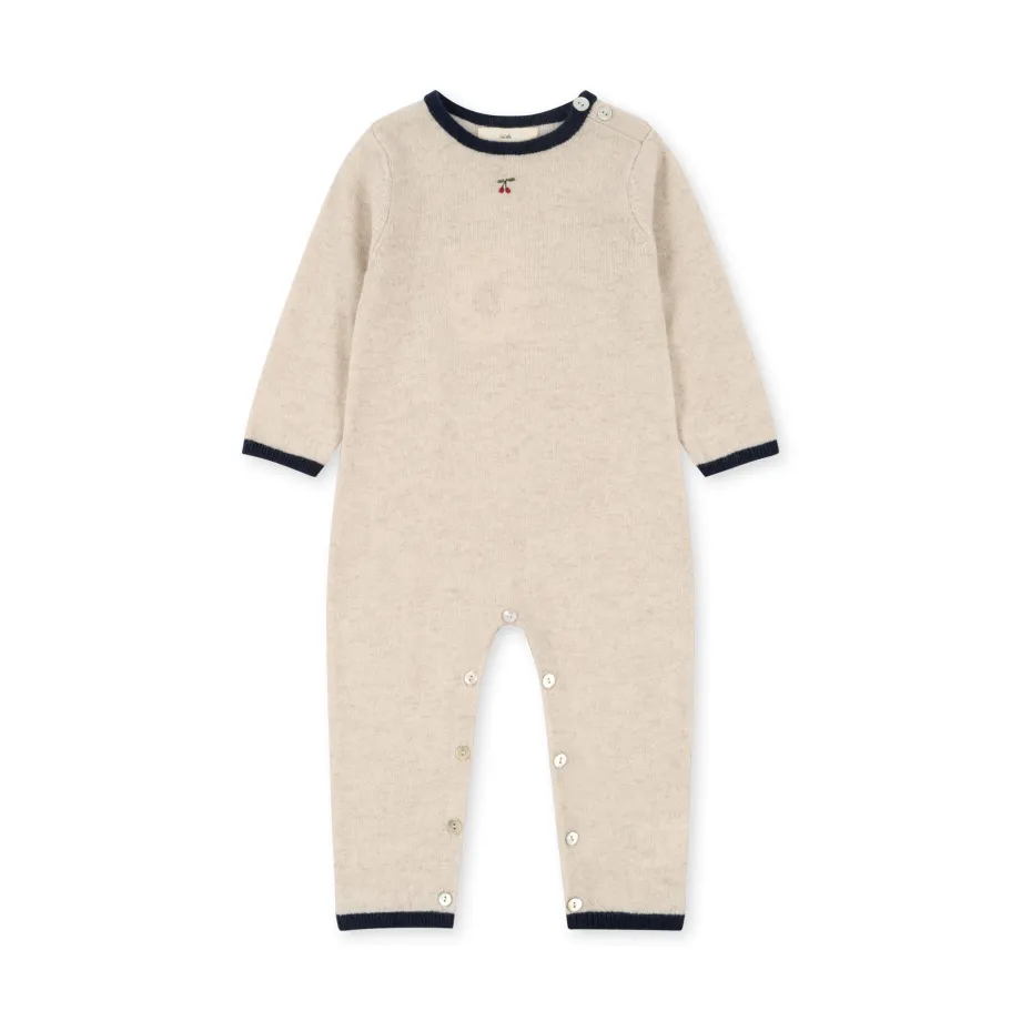 Blød heldragt med perlemorsknapper langs benene. Fremstillet i 100% cashmere.