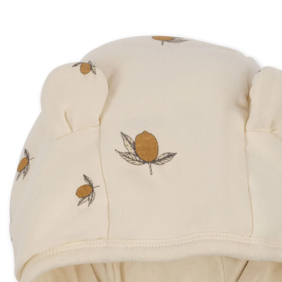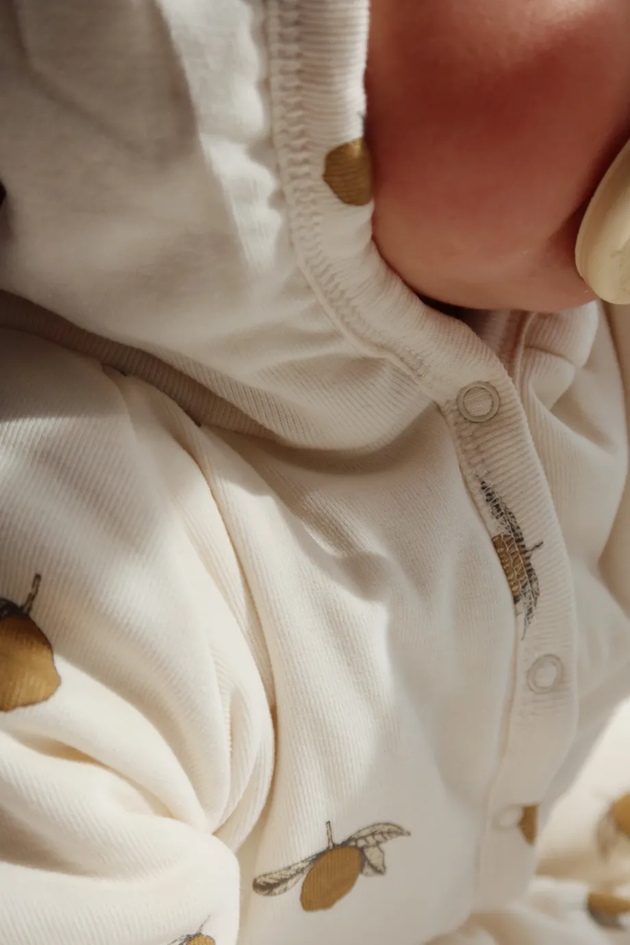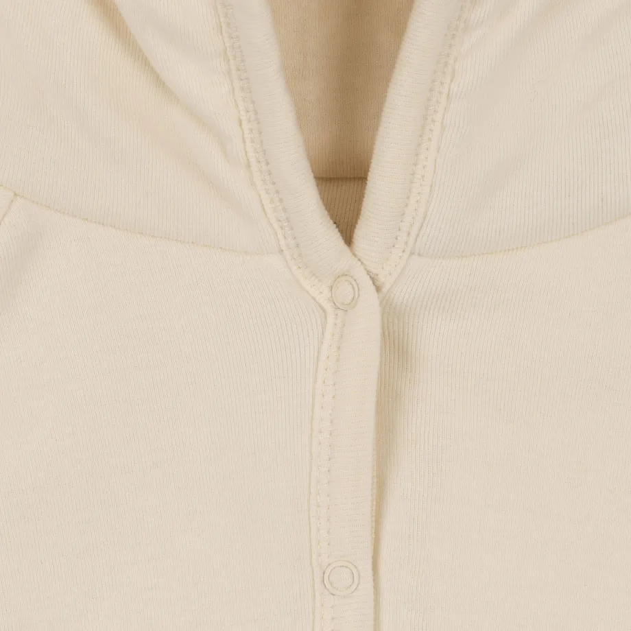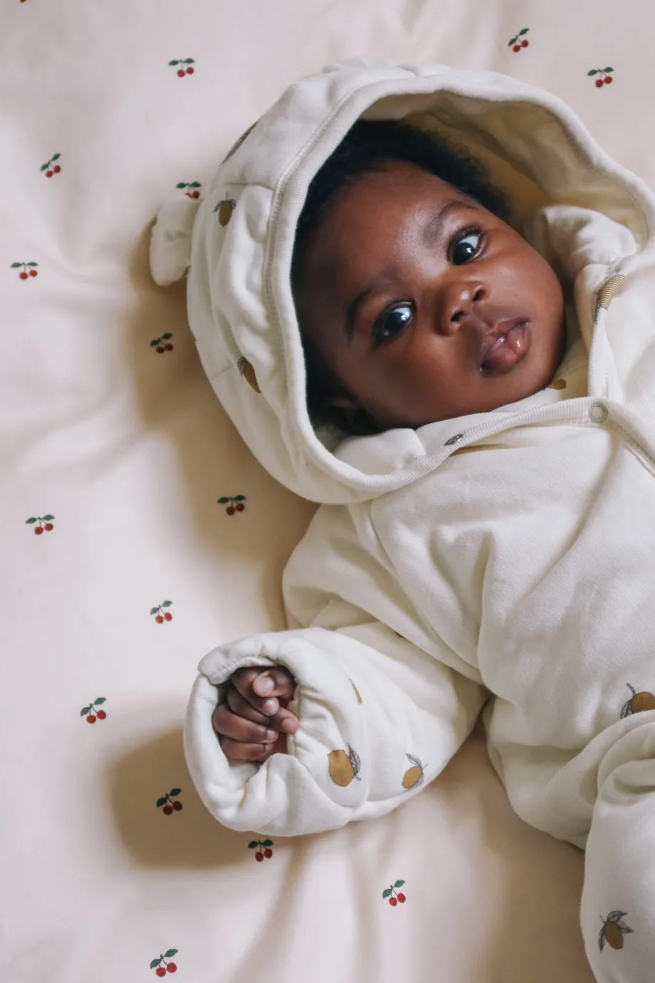 Vores let-vatteret newborn-onesie med hætte har de sødeste små ører og er lavet med foldbare hænder og fødder. Vælg mellem forskellige farver og print. Fremstillet i 100 % økologis