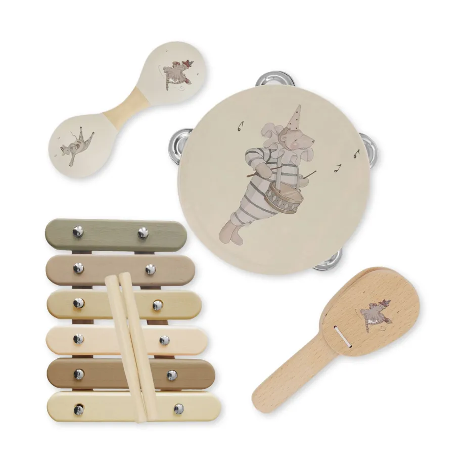 Sæt af træinstrumenter til små musikanter. Sættet består af: – 1 x tamburin. – 1 x castanet. – 1 x maraca. – 1 x xylofon med trommestikker. Fremstillet i 100 % træ. CE-testet efter