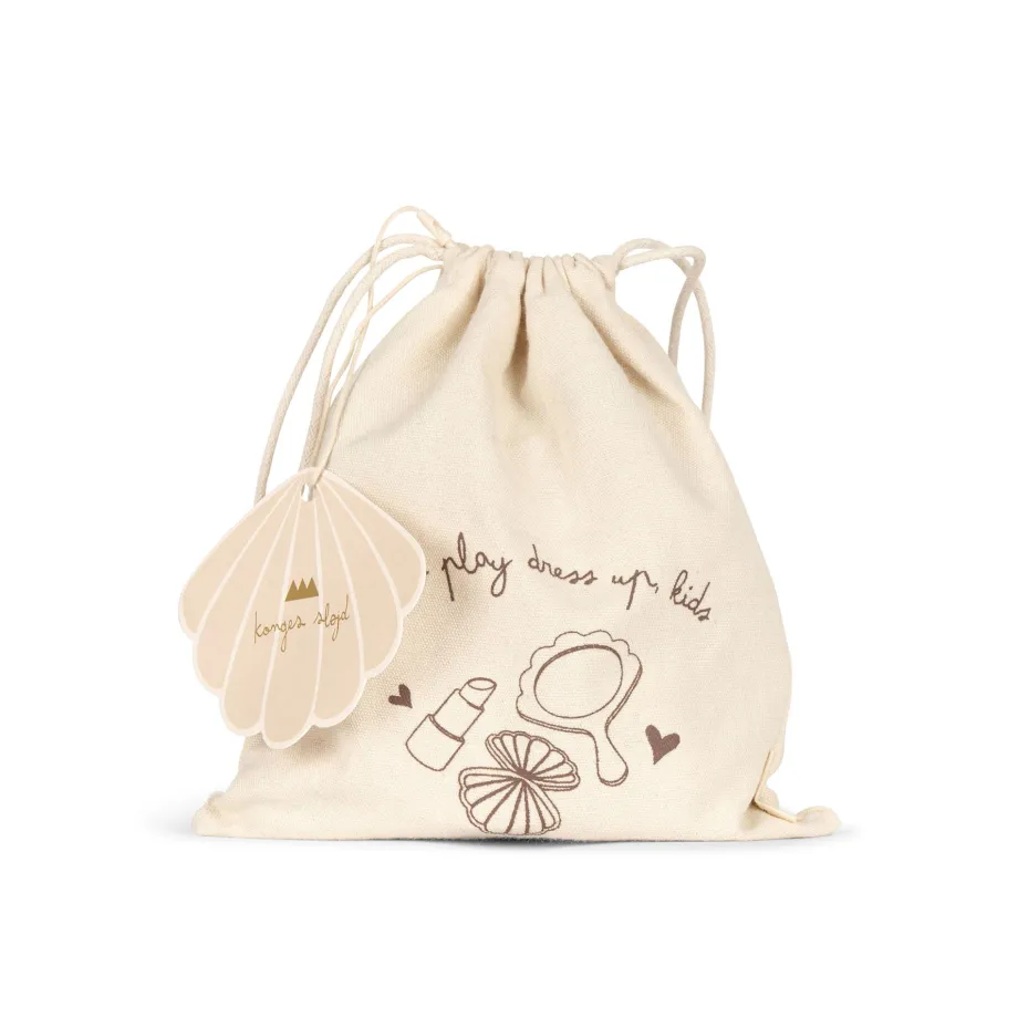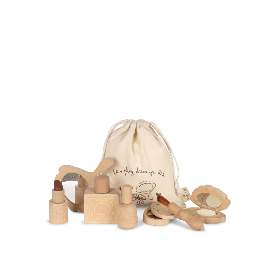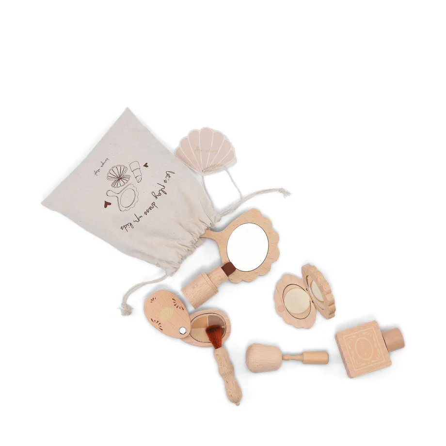 Dette søde lille makeupsæt er perfekt til leg og udklædning. Leveres i en lille bomuldspose og består af 7 dele: læbestift. spejl. flaske. neglelak. rouge med spejl. øjenskygge og