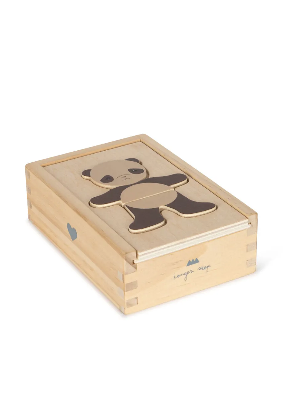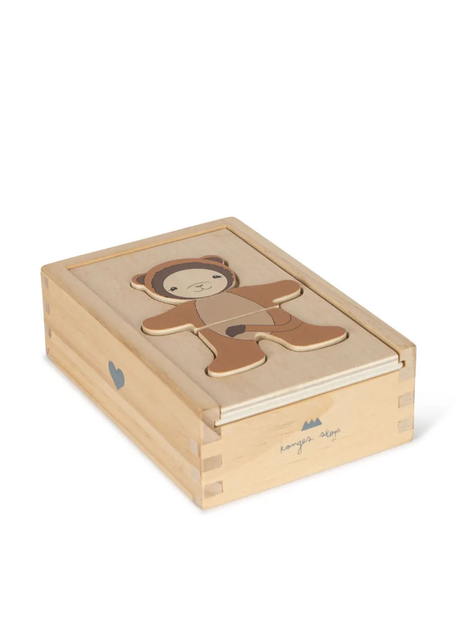Påklædningspuslespil med vores lille yndlingsbamse. Leg med forskellige muligheder og kostumer til bamsen. Inkluderer: 4 outfits. 27 puslespilsbrikker. En kasse med låg til opbevar