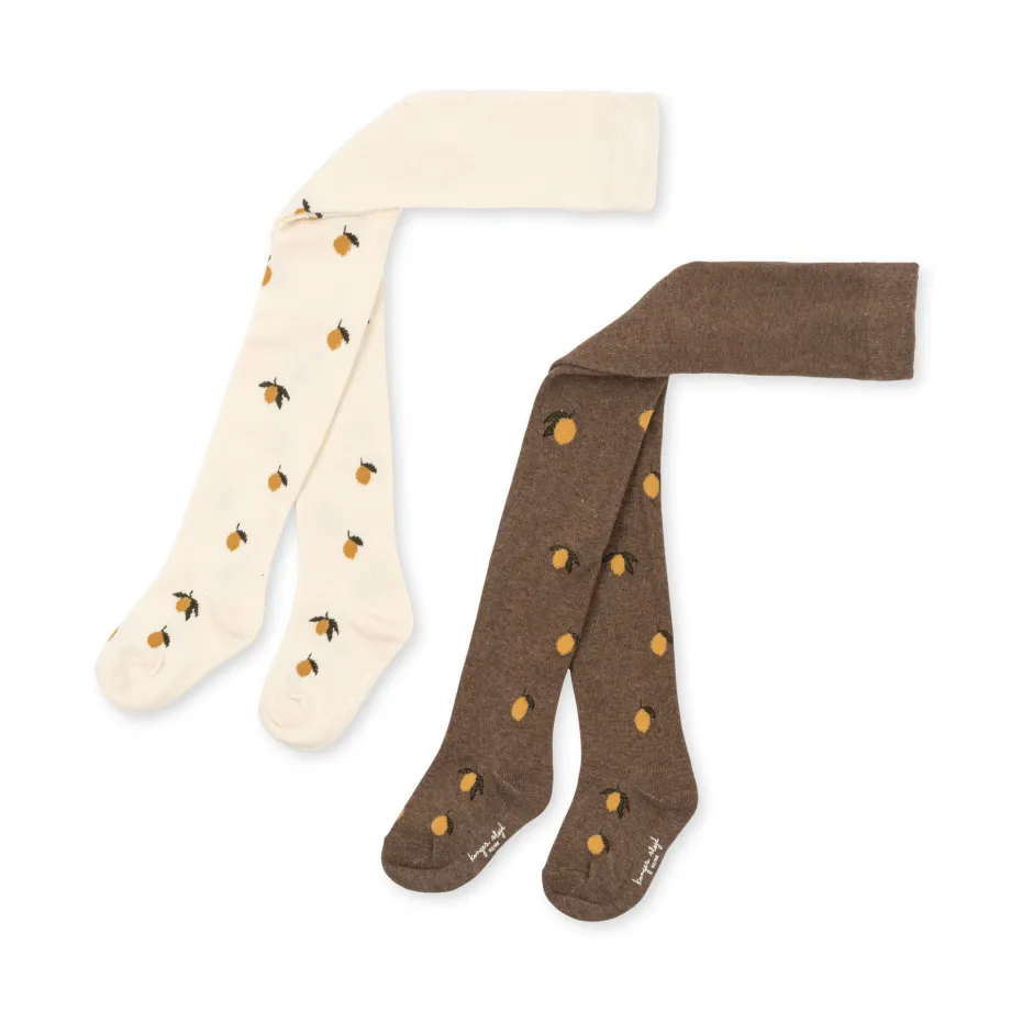2-pak bløde strømpebukser med citronmønster og stræk. Lavet af 75 % økologisk bomuld. 23 % polyamid og 2 % elastan.