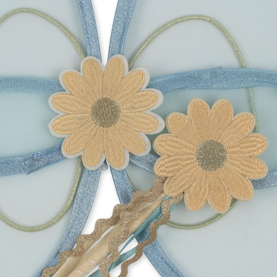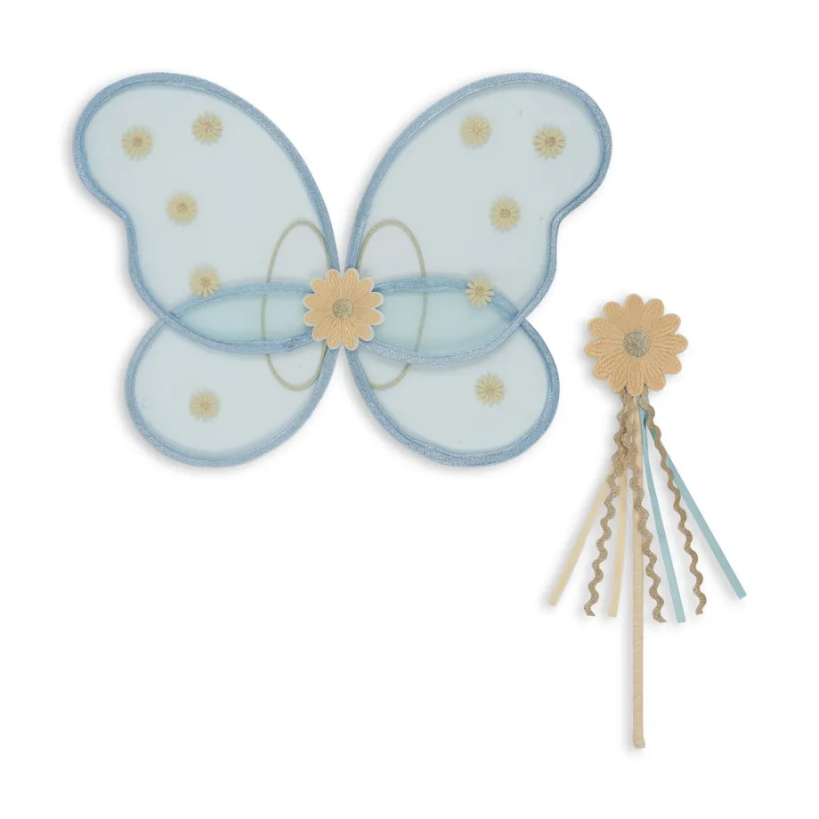 Fekostume med vinger og en tryllestav til at sprede magi. L: 39.5 cm x B: 49 cm Materialer: Vinger: stof i 100 % polyester. Tråd: 100 % metal. Glitter: 100 % polyetylentereftala