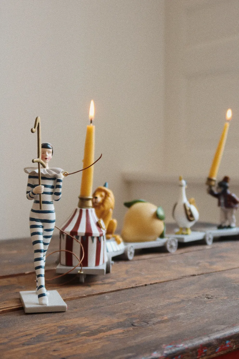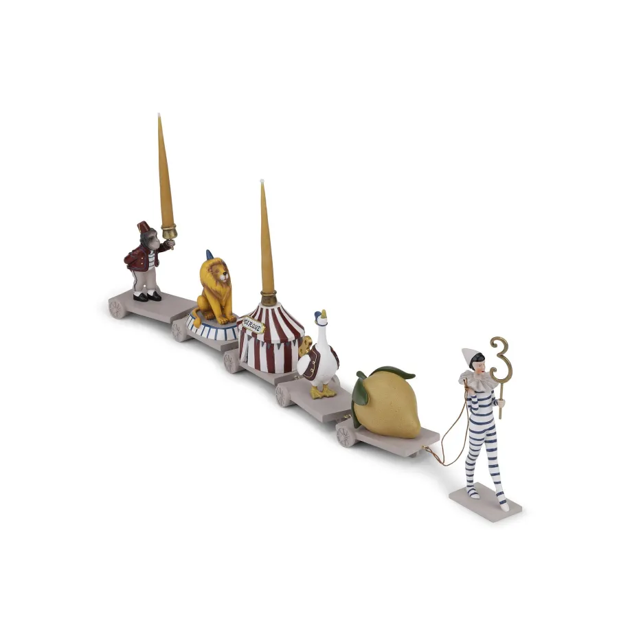 Dette unikke håndlavede fødselsdagstog pynter ethvert fødselsdagsbord med stilfuld finesse og kan bruges til alle aldre. Vælg mellem: – Pjerrot går med en citron. en gås. et cirkus