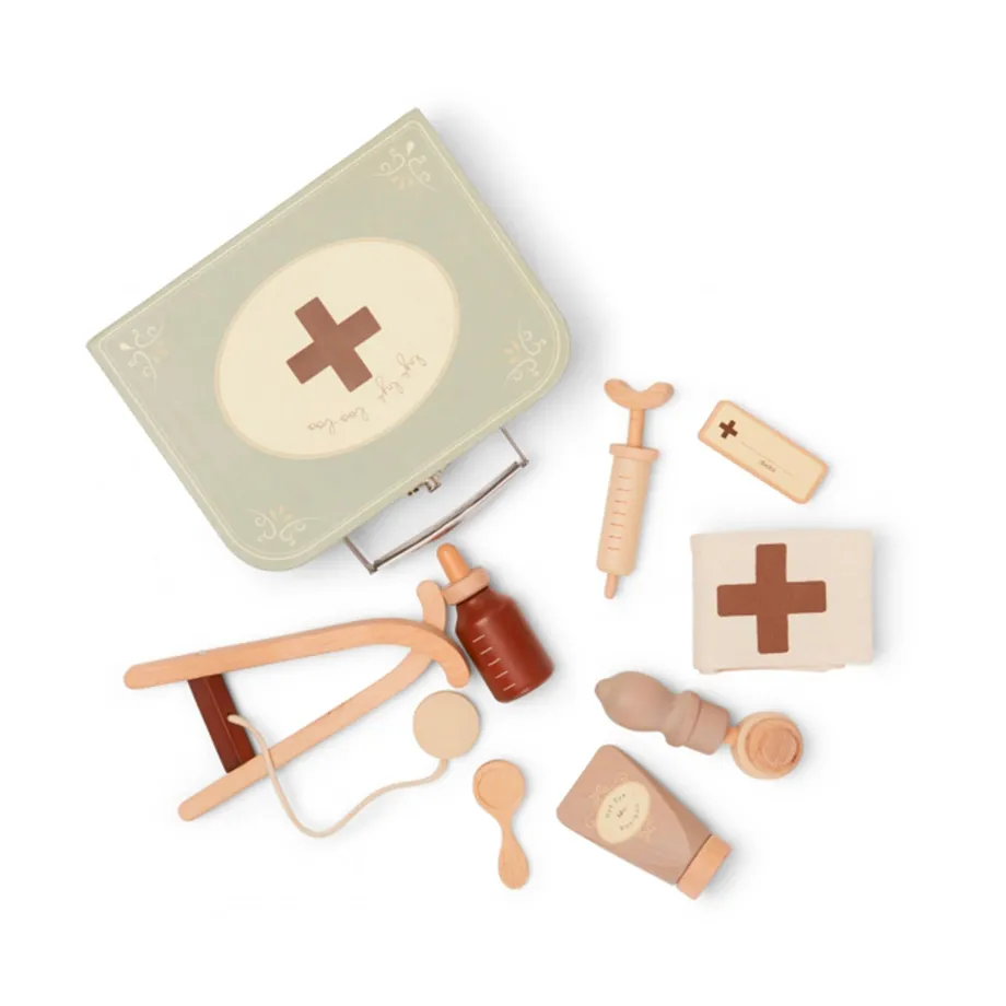 Dette lille sæt garanterer timevis af leg. Indeholder: – tube med sårcreme. – et stetoskop. – en sprøjte. – medicindråber. – en ske. – et otoskop. – en bandage. – en lægenavneskilt