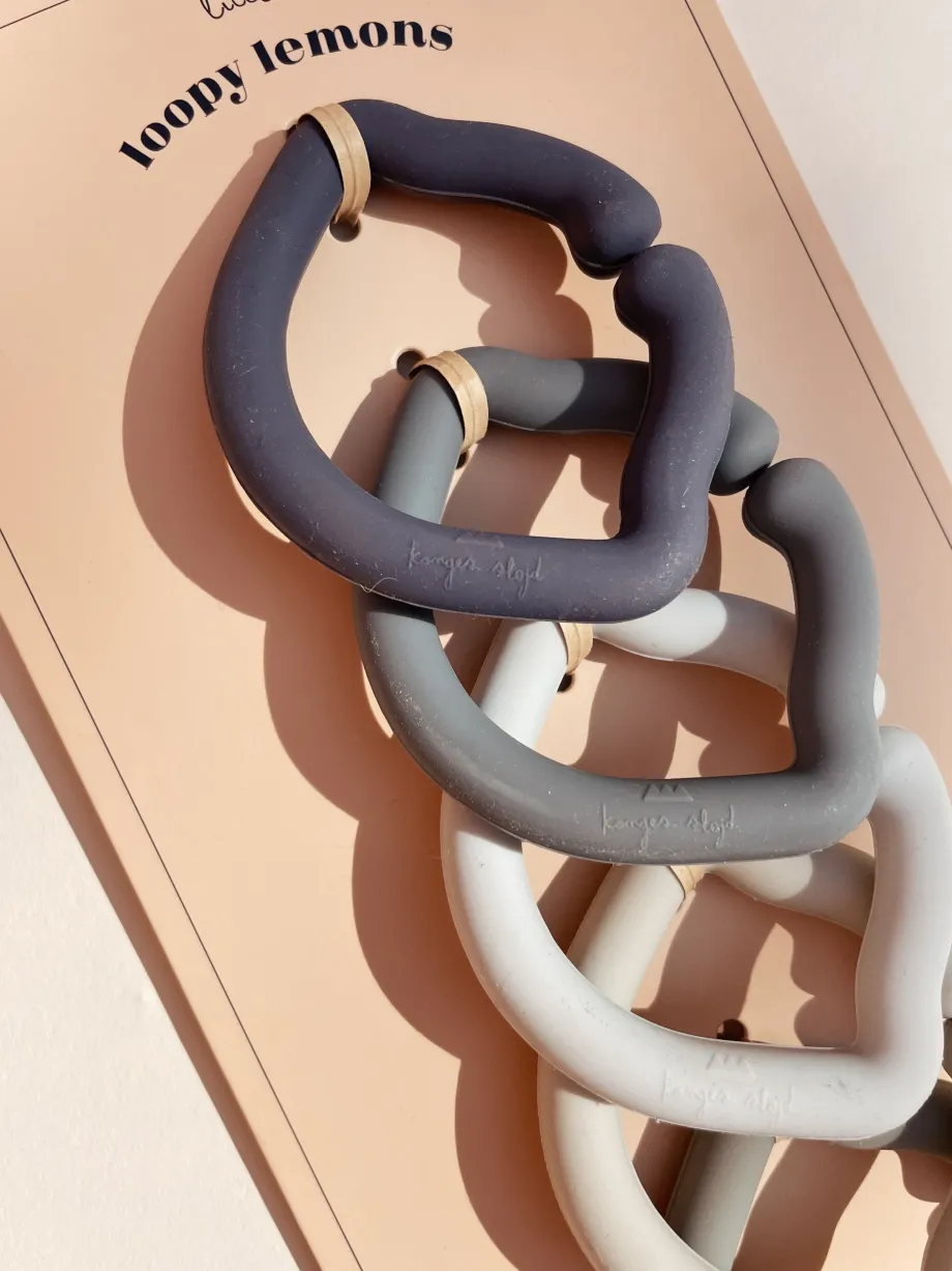 Loopy Lemons-ringene er lavet til at hænge legetøj på aktivitetsstativet med. som babyen kan se på og lege med Fås i 5-pak – vælg mellem to farvesæt Fremstillet i 100 % silikone