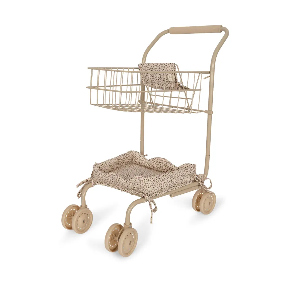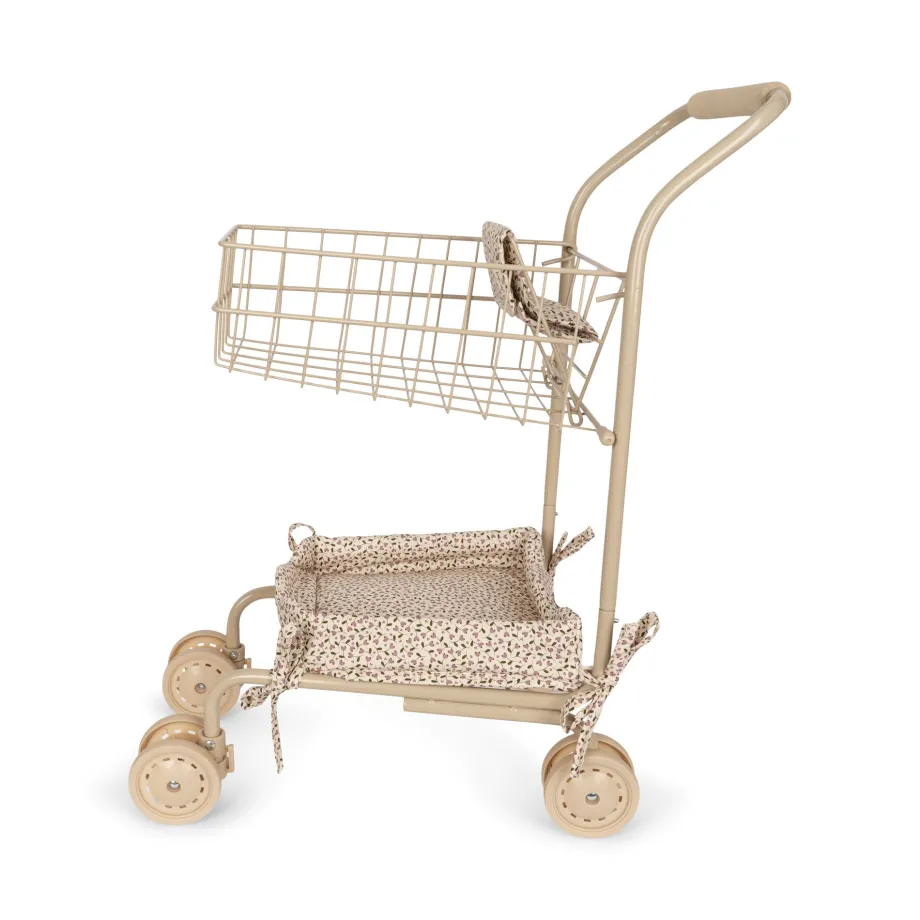Legeindkøbsvogn fremstillet i 50% genbrugsbomuld og 50% bomuld med fyld af 100% genbrugspolyester. Stellet er lavet af 100% jern med bløde håndtag. H: 57.5 cm x B: 45 cm x D: 30