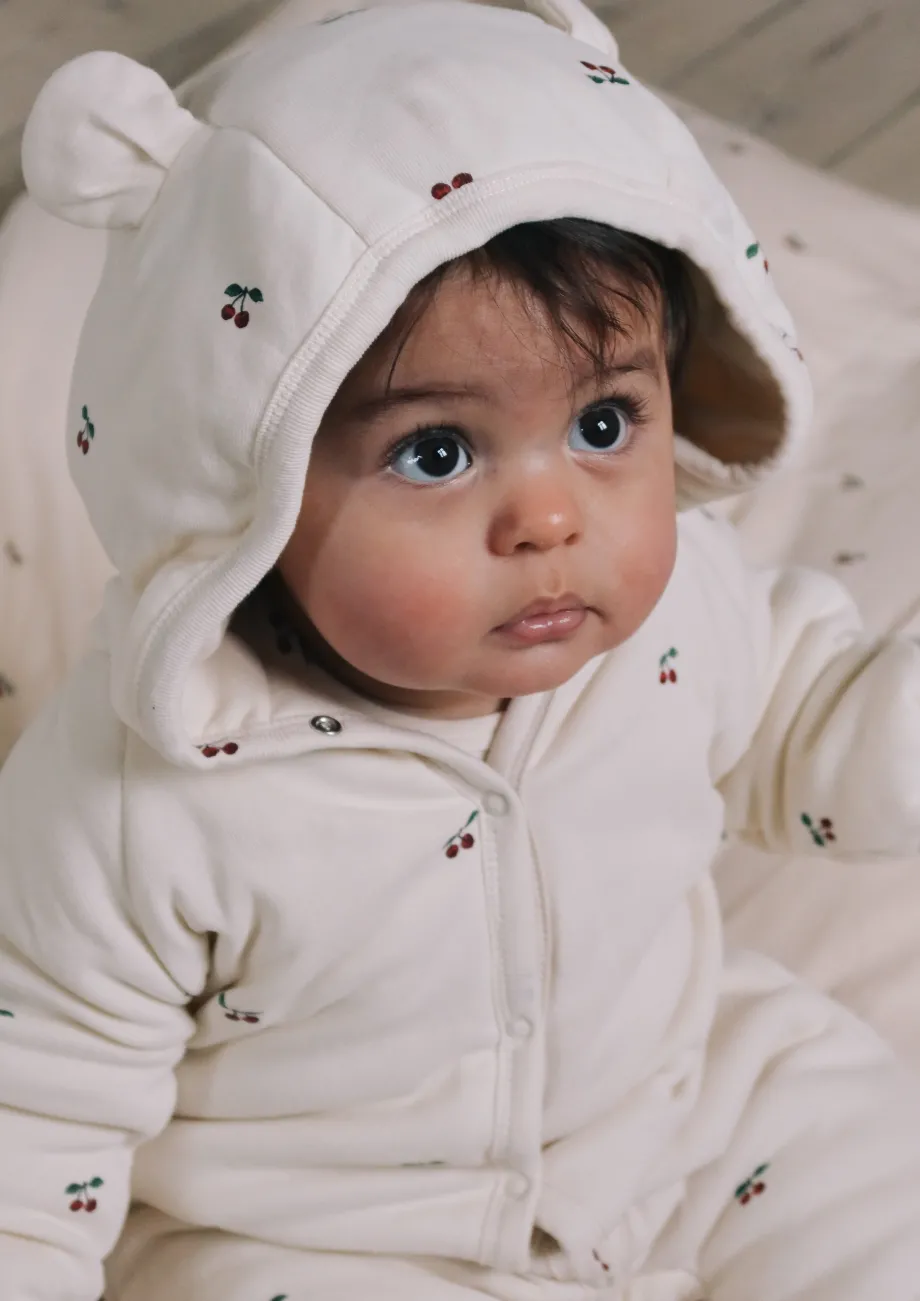 Vores let-vatteret newborn-onesie med hætte har de sødeste små ører og er lavet med foldbare hænder og fødder. Vælg mellem forskellige farver og print. Fremstillet i 100 % økologis