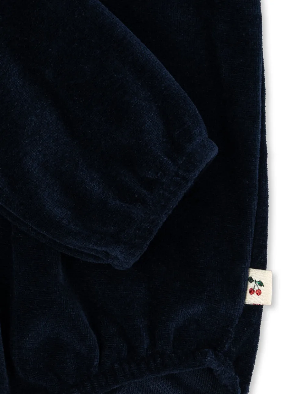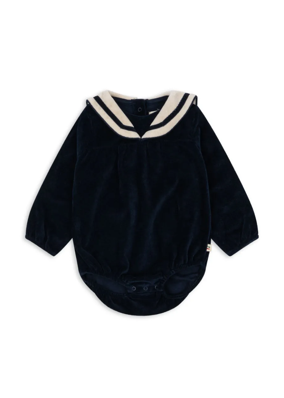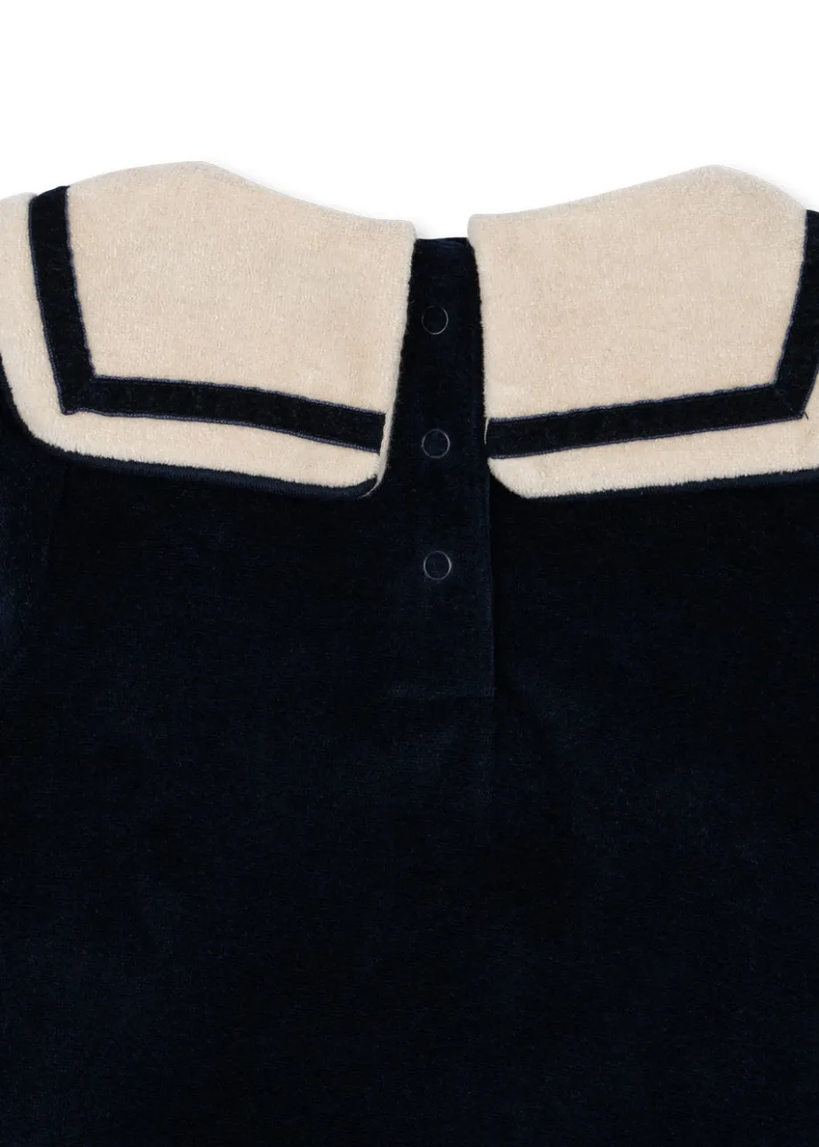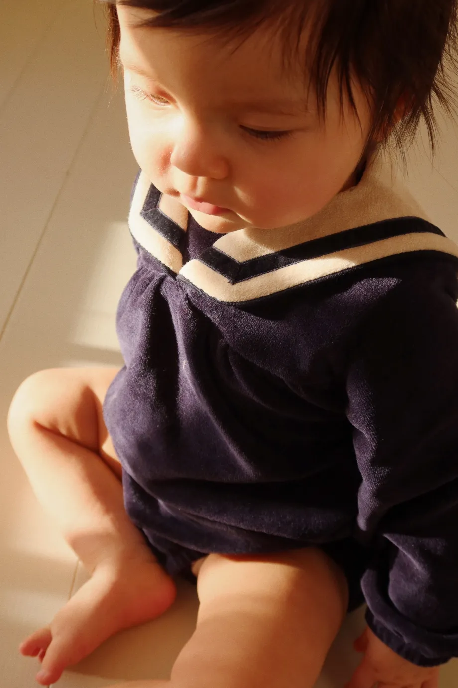 Blød romper i velour med sømandsdetaljer. Lavet af 80 % økologisk bomuld og 20 % polyester GOTS. lavet af 80 % økologiske materialer. certificeret af CU1094701
