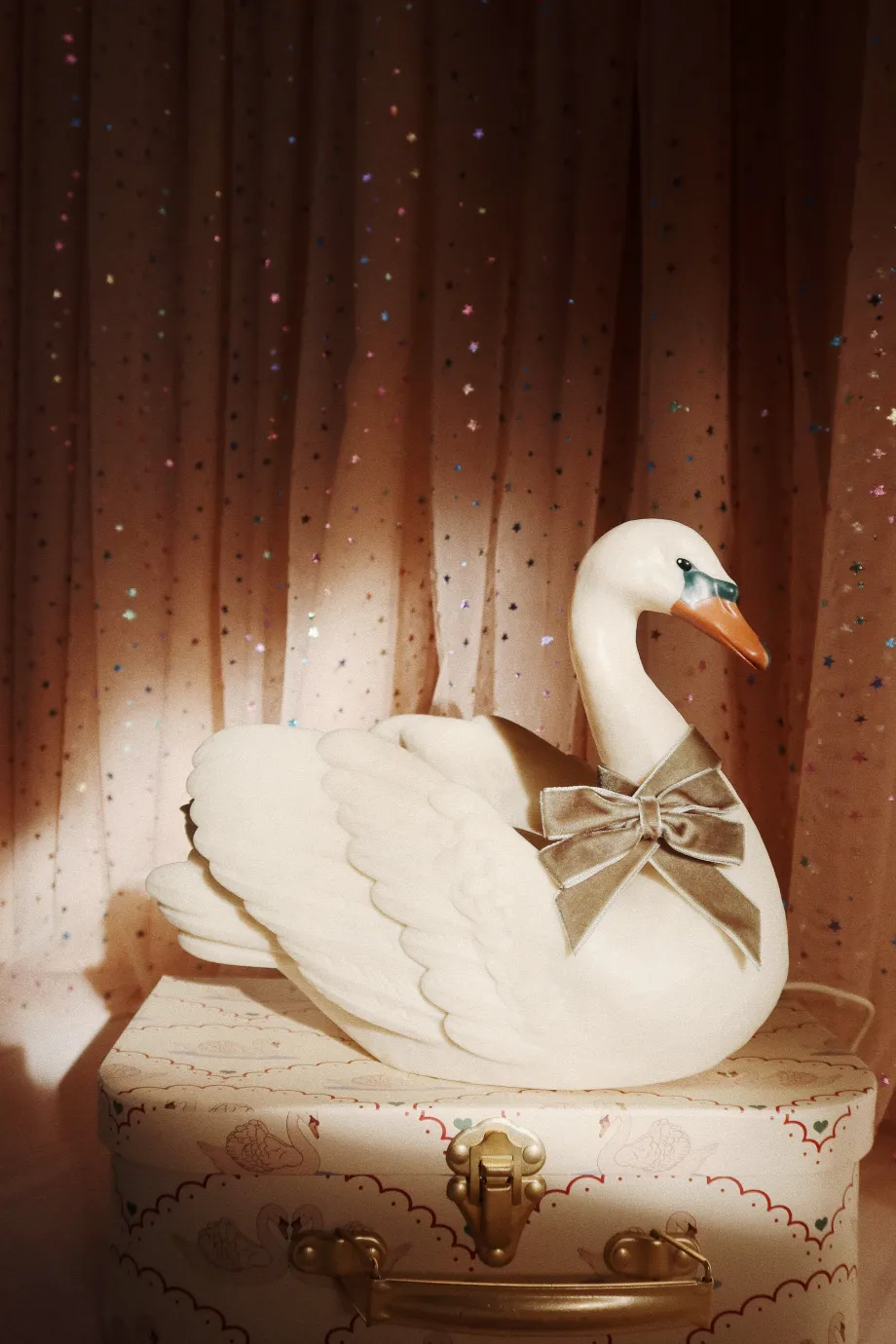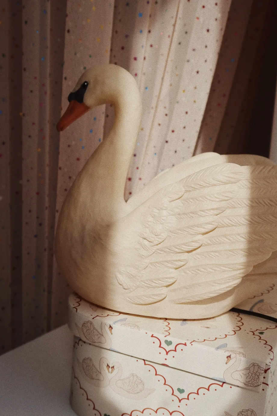 Svaneformet lampe med justerbart lys. Effekt: 3 W Indgangsspænding: 5 V 110-240 V Kabel: 2 m Yderlag: PVC Fod: ABS Lampe: LED L: 24 cm x B: 15.8 cm x H: 18 cm