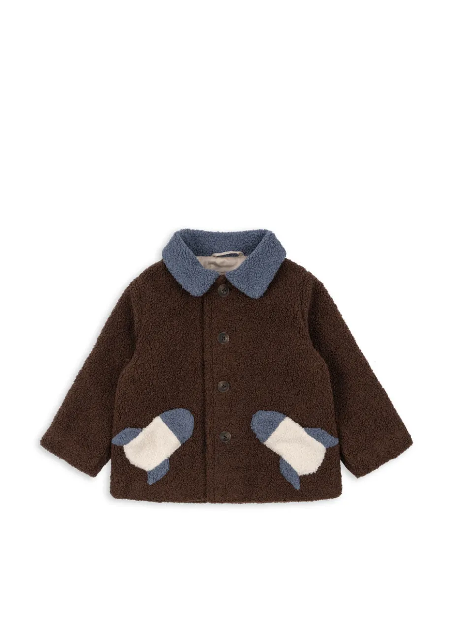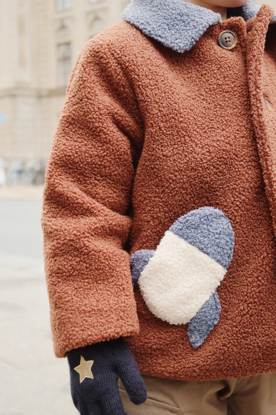 Klassisk. vamset frakke med rund krave. lommer formet som raketter og lige snit. Lavet af: – Hovedmateriale: 100 % polyester – For: 100 % bomuld og 100 % polyester