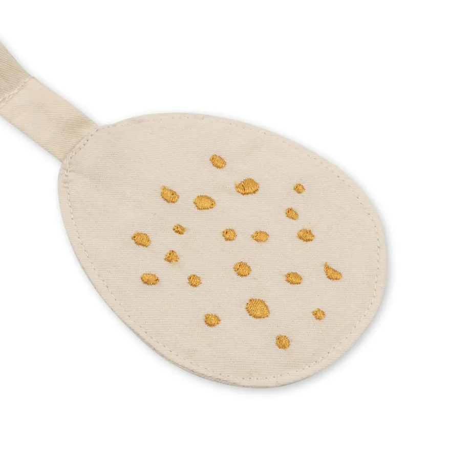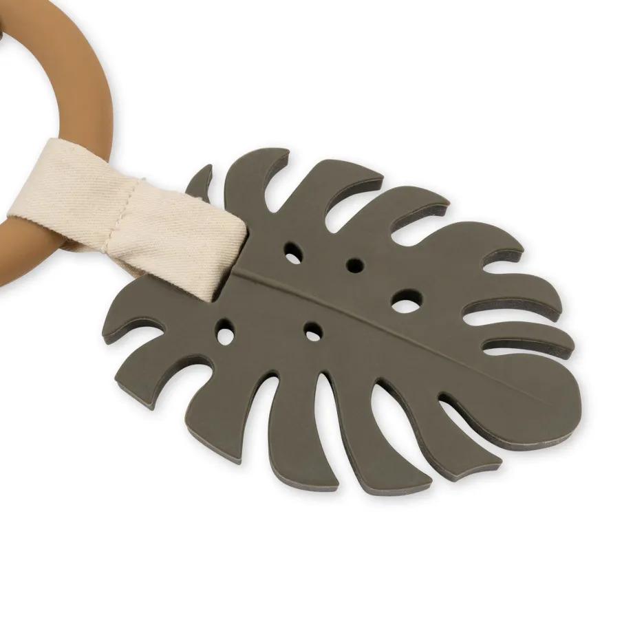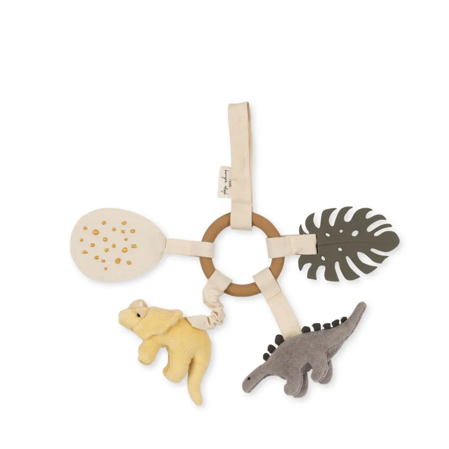 Denne lille dino-stofring er perfekt. når din baby skal lege og have stimuleret sine sanser. Det er en træring. hvor en masse ting er sat på: et lille blødt tyggeblad. snipper at
