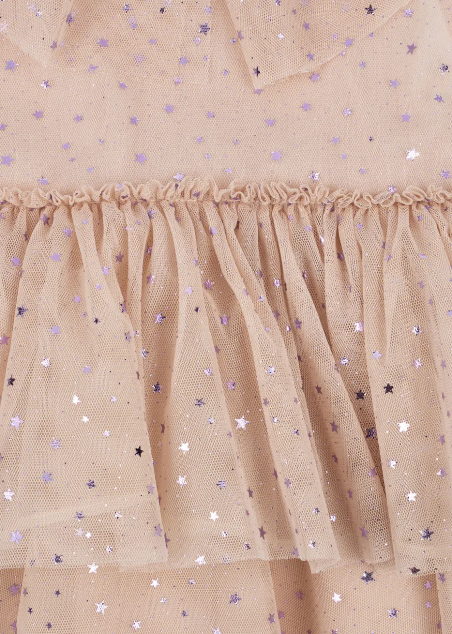 Kjole med tylskørt og en stor. rund krave. Lukkes bagpå med en enkelt perlemorsknap. Lavet af 100 % polyester med 100 % bomuldsfor. Dette produkt er certificeret i henhold til OEKO