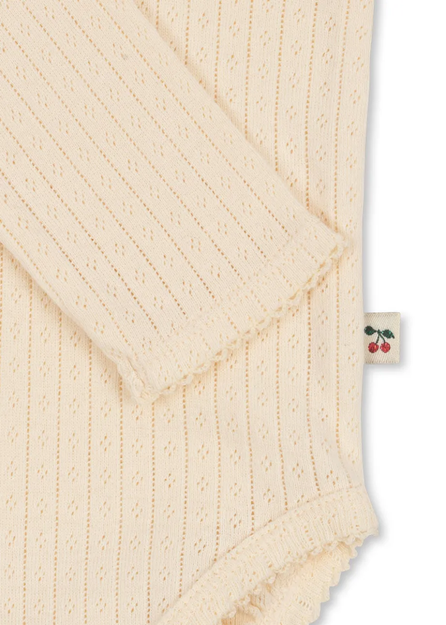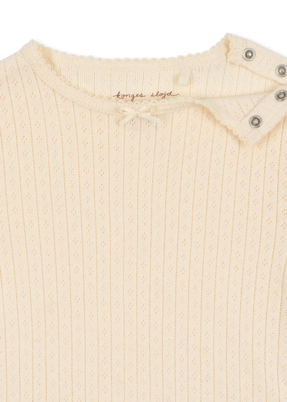 Blød bodystocking i bomuld med dekorativt hulmønster. Med praktiske trykknapper i skridtet. Et blød og behagelig basisbluse. der er uundværlig i garderoben. Lavet af 100 % økolo