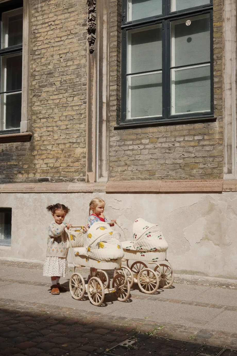 Dukkebarnevogn i vintagestil med fire store hjul. der gør vognen nem og stabil at gå med. Designet i en lidt lavere størrelse. som er nemmere for små dukkeforældre at navigere. Me