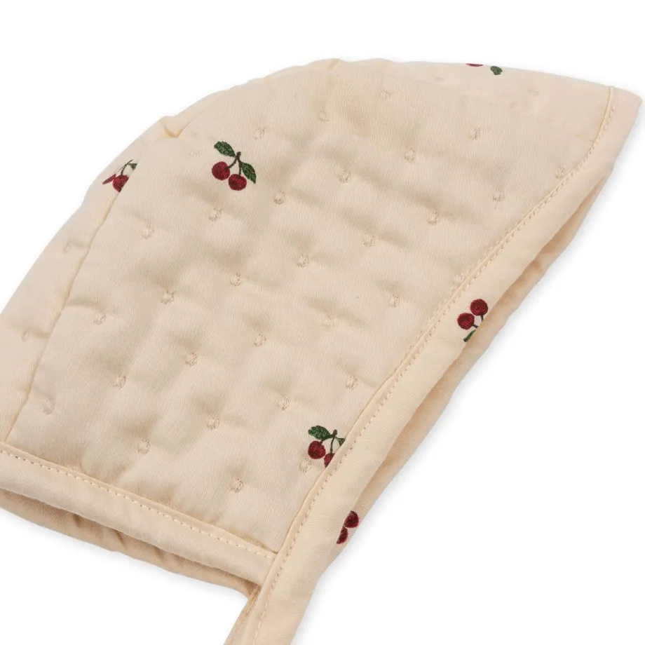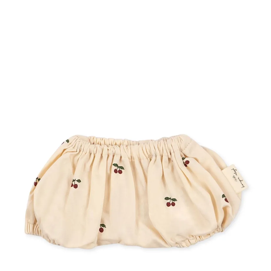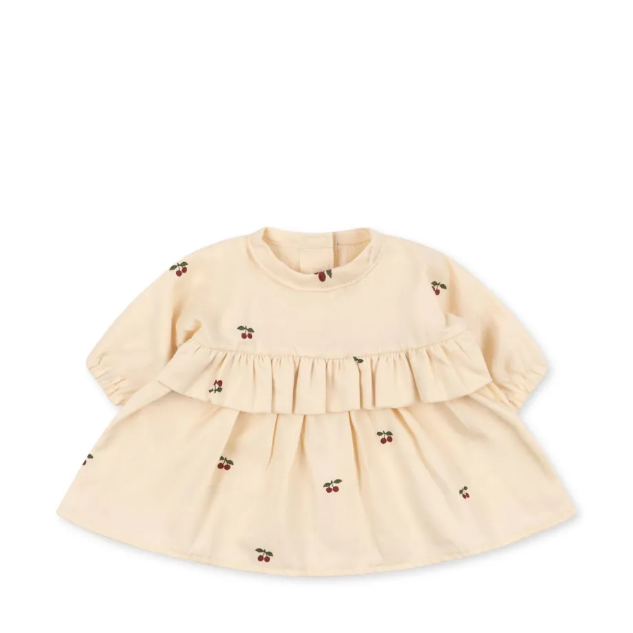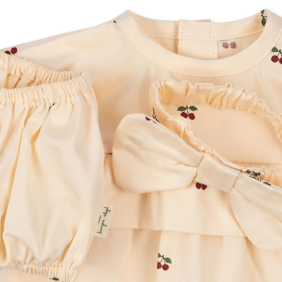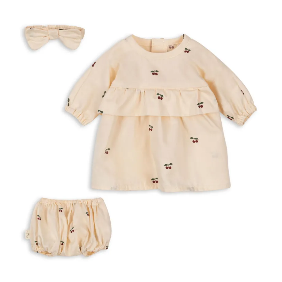 Kjole. bloomers og blød hue. der er designet med to lige bånd. så den kan bindes under dukkens hage. Fremstillet i 100 % økologisk bomuld.