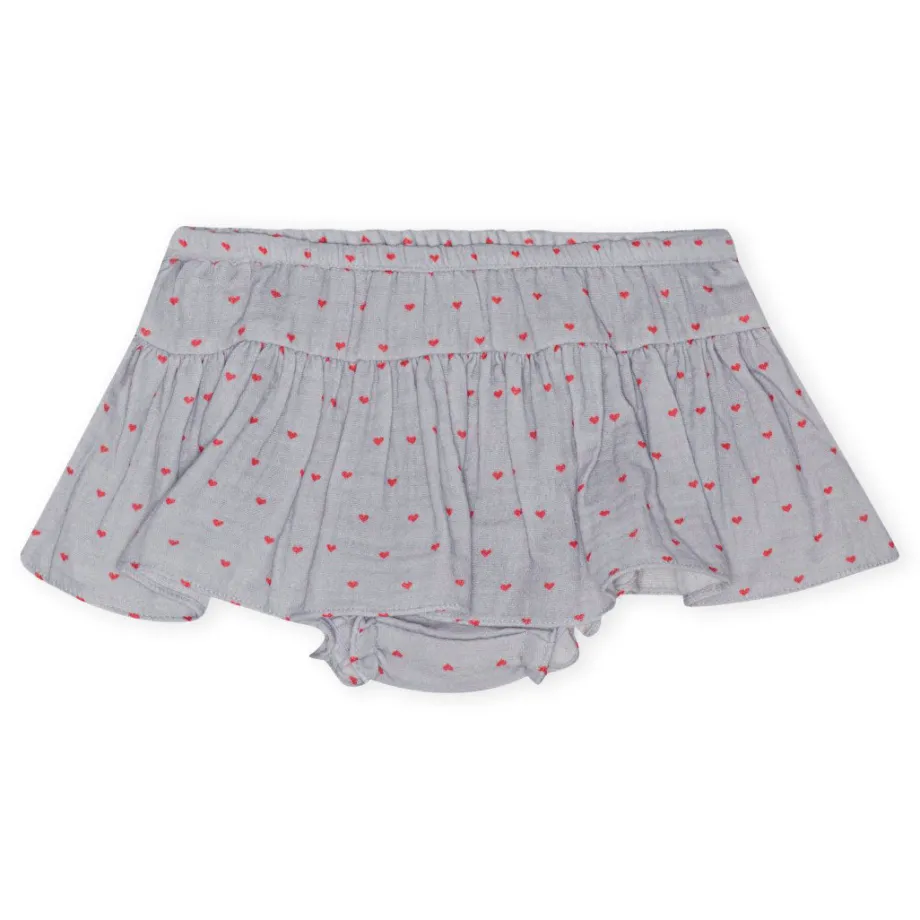 Bløde bloomers i 100 % økologisk bomuldsmusselin. Designet med blød elastisk talje. flæseskørt og elastiske benåbninger med babylockkanter.