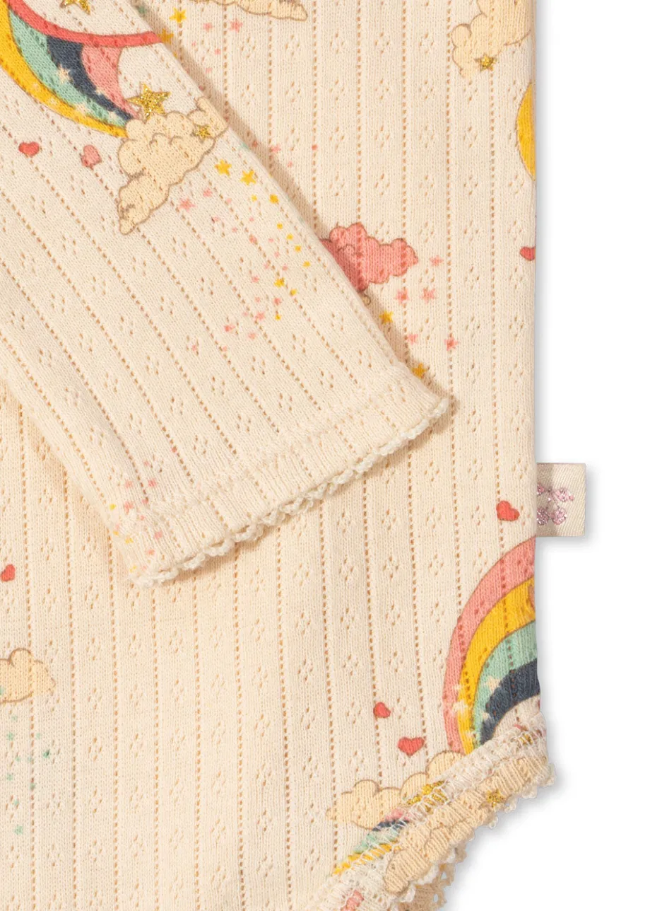 Blød bodystocking i bomuld med dekorativt hulmønster og glimmerprint. Med praktiske trykknapper i skridtet. Et blød og behagelig basisbluse. der er uundværlig i garderoben. Lave